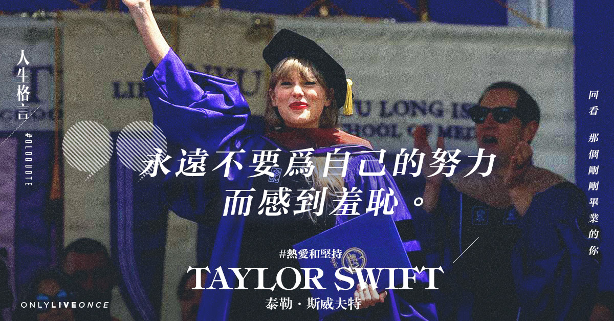近日獲頒紐約大學榮譽藝術博士學位的 Taylor Swift,發表的畢業演說贏得全場掌聲。20 多分鐘的演說裡金句滿滿,其中「不要為你的努力感到羞恥」最能反映她的堅毅。從 12 歲愛上創作音樂,再慢慢踏上歌手之路,短時間裡已屢獲獎項,一切看似垂手可得,令人彷彿忘了她背後的努力和掙扎。