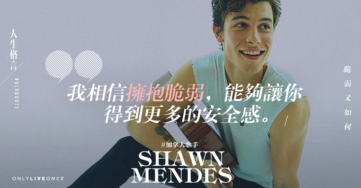 加拿大歌手 Shawn Mendes 近年在心靈上有種學習。他曾分享到:「在過去的幾年,我努力讓自己不做錯事、不說錯話。彷彿有把聲音說『如果你不夠努力,你就會失去大家的支持』。」他覺得這個心態令他越來越不妥,所以想到要開始做點小改變。一向在意他人看法的他,重複練習跟身邊的人表達內在的脆弱,不再只展示好的一面。他願意承認自己內在的不足,亦容許自己在他人面前沮喪。調整的過程漫長,但他已經開始了第一步。