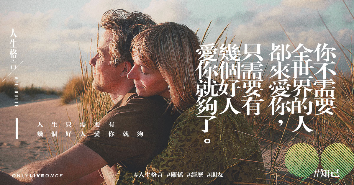 日子久了你會發現自己在關係中總是飾演配角,在大型聚會中充當分母,要找人幫忙第一時間想到你,一起旅行卻沒邀請你。以前我們會說這些是人「交際花」、「世界仔」,說得好像是社交達人似的,其實他們自知沒半個知心可信的朋友,在心情低落想找人傾訴時不知道該找誰,心裡藏著的秘密找不到可分享的對象。我們不需要一百個,甚至二十個酒肉朋友,只需要有兩、三個知己,在你想哭時會主動來安慰你,在你失戀時二話不說放下工作來陪你,在你想發瘋時放下偶包跟你一起瘋。這樣的關係可以維持很久,甚至接近一輩子。如果你已經找到了,請好好珍惜,能相知相聚是一輩子修來的緣分。