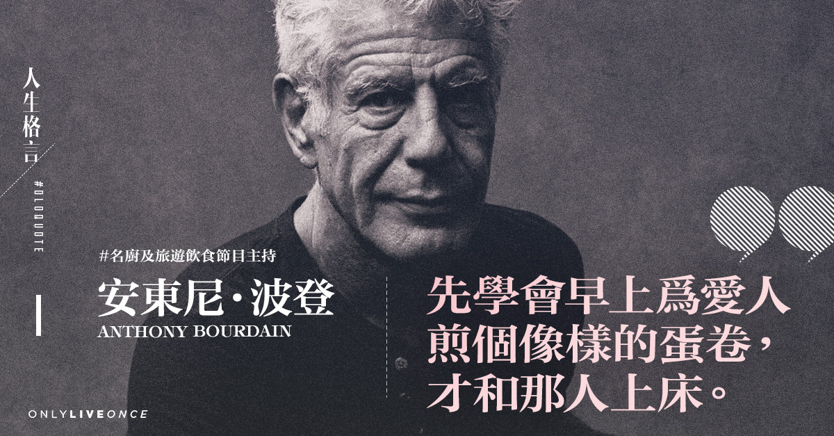「每個人都應該要會煎蛋捲。」是波登的堅持。有此想法,皆因波登非愛炫耀奢華的飲食體驗的廚子或食評,也認為飲食真諦不是盲目「支取」,而是用心「付出」,他生前走遍世界探索飲食故事:從不走特別通道,專心跟街坊排長龍等吃一個熱狗;帶着前美國總統奧巴馬,到越南小店品嚐道地豬肉米線和啤酒;過境台北僅 48 小時,亦專門搭火車往基隆品嚐海瓜子;非常敢言,著書《廚房機密檔案》揭露時尚豪華餐館的黑暗面,是非一般的美食達人。