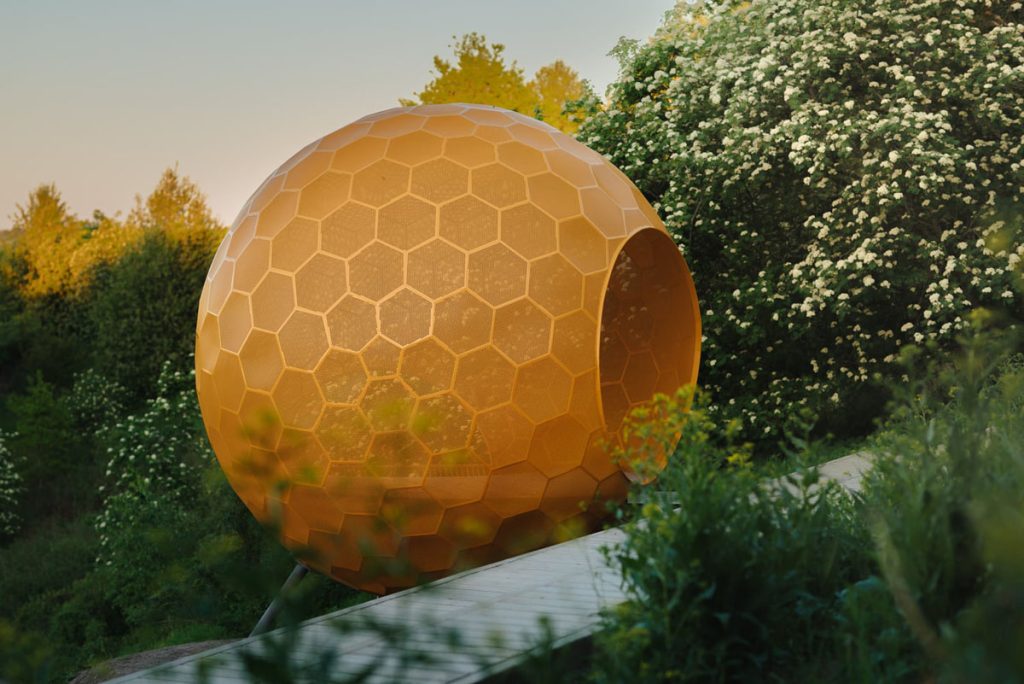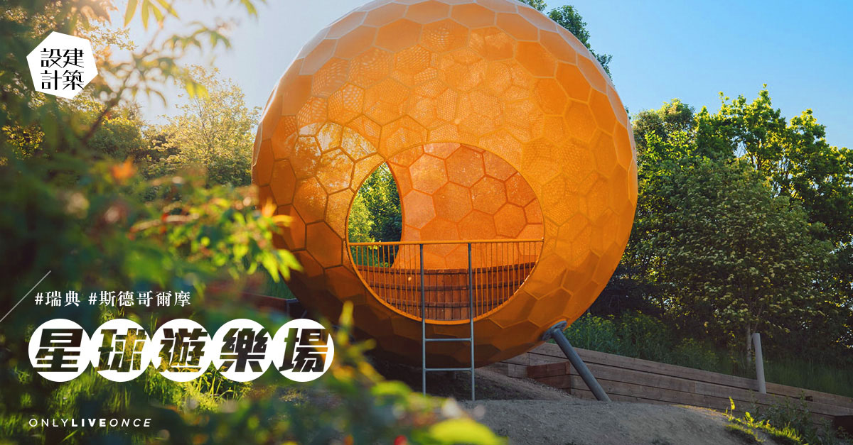 在綠意盎然的小山丘上,忽然出現一個個金黃色的鏤空金屬球體,就像星球般的存在 —— 這些「星球」位於瑞典斯德哥爾摩,是建築公司 Andrénfogelström 於 Vårbergstoppen 公園所打造的全新遊樂場景觀。