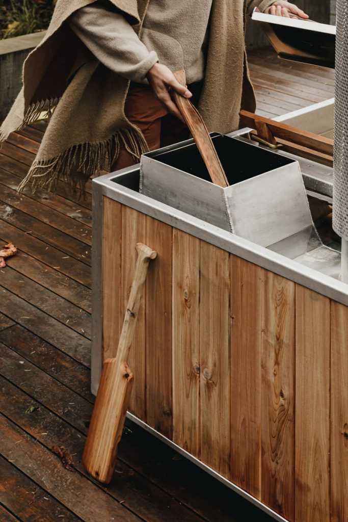 創製時,設計師特別考慮到疫情後,人與人、人與自然之間的共生問顯,因而特別鼓勵用家不只將澡缸帶到自然中,也鼓勵大家將收集得來的木頭切碎、堆放、點火、攪水及調溫的過程中,多去觀察樹木、花草、空氣或水源的狀態,以及自己或親朋浸浴時的心情等,一方面徹底放鬆心神,另一方面也重新致敬洗澡此傳統文化。
