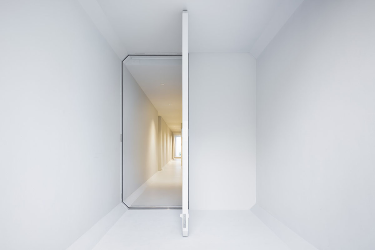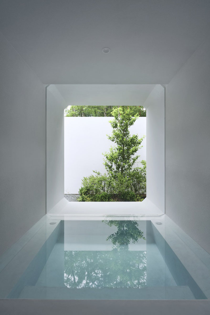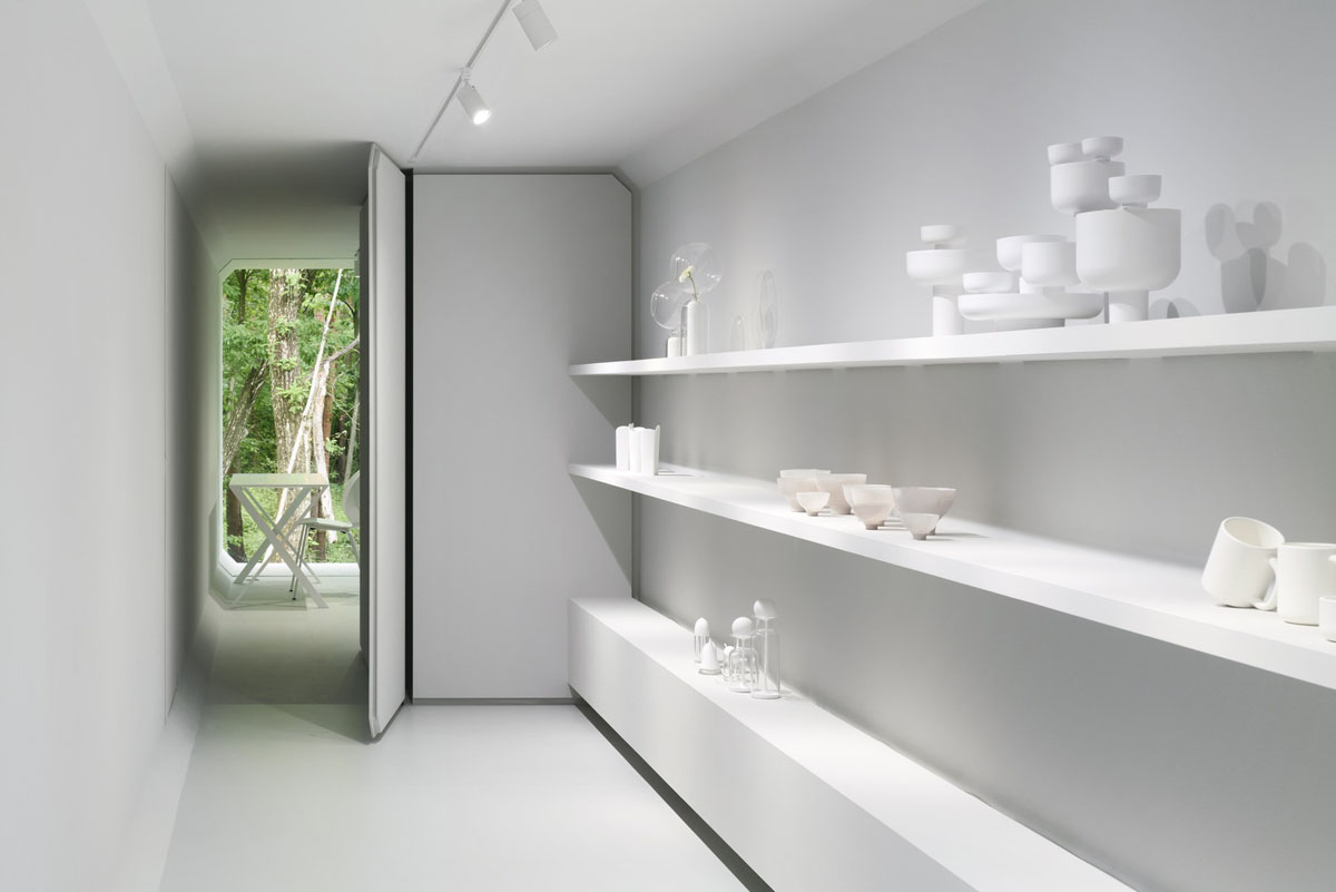 設計雖極簡,卻處處都是細節。Nendo 特意使用大量高透光的無框玻璃,並將其固定在牆內的凹槽中,使人們在屋內亦能更清晰地欣賞周遭美景;為了不讓門的把手等必要卻突兀的功能出現在畫面中,他們更刻意將門把放置於門與牆壁之間的細縫中,使屋內的整體觀感更和諧。至於浴室更是特別,浴缸採用下沉式,當其注滿水後,地板及水面便會連成一線,看起來像是連續、不間斷的平面。這裡無暇潔淨得讓人猶如走進了一個科幻時空,每處細節都無可挑剔。