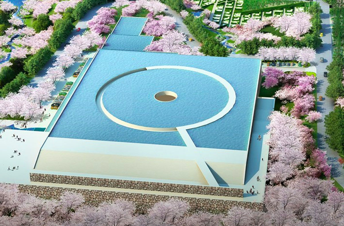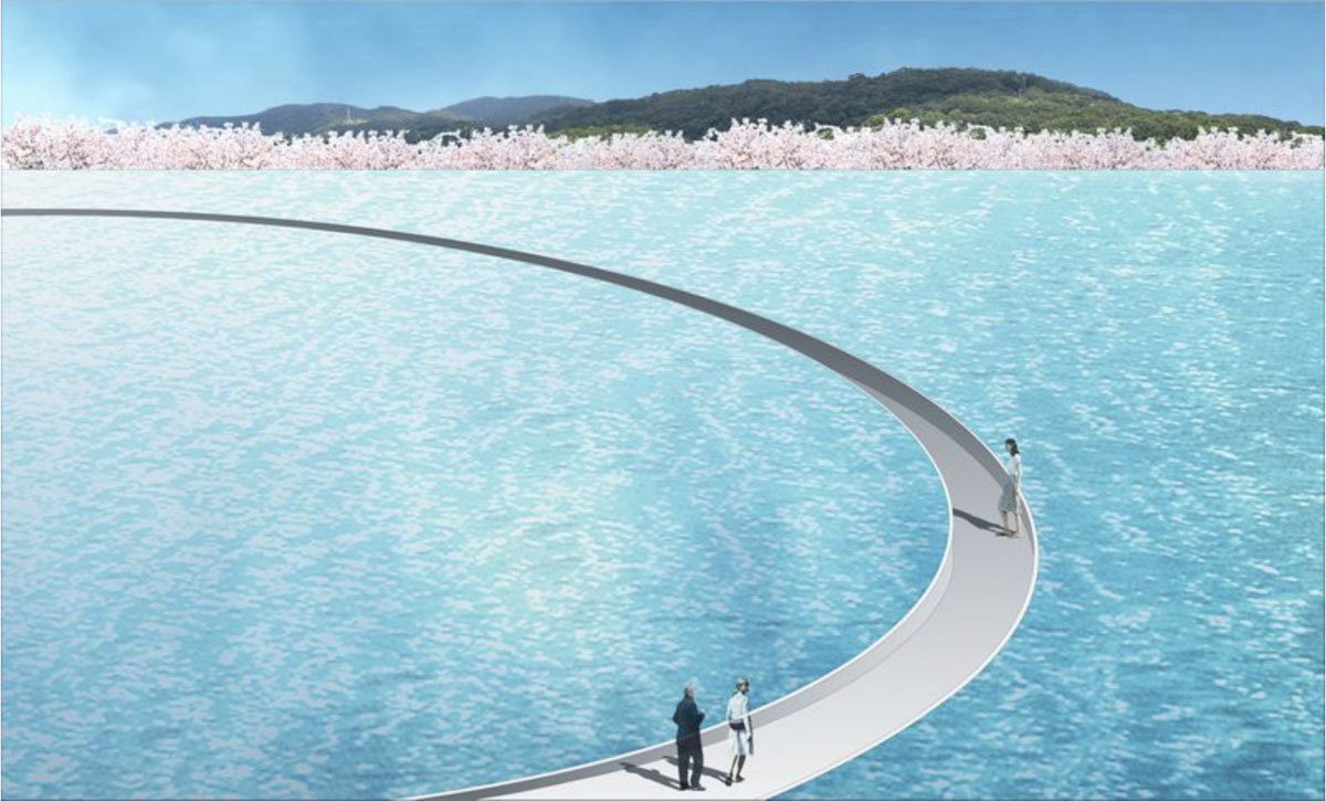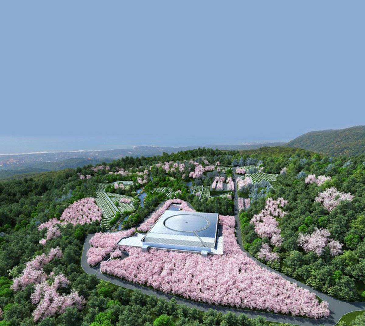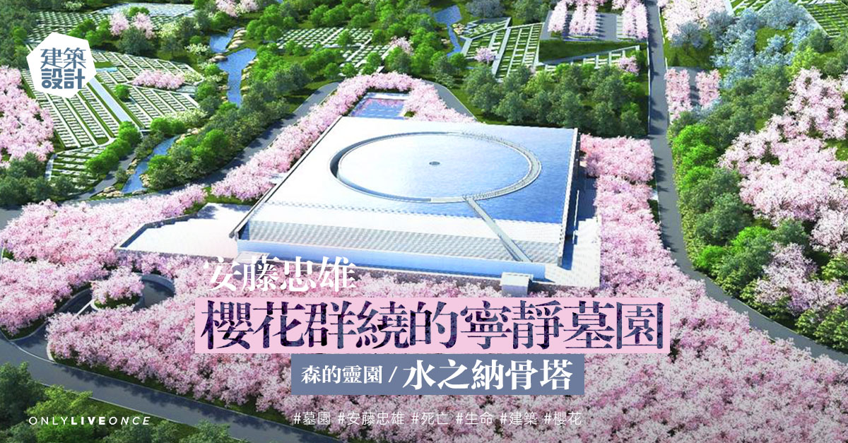 設計師是日本知名建築大師安藤忠雄,如果你喜歡他的建築,一定聽過或看過他在大阪設計的「光之教堂」或北海道「水之教堂」,建築師對宗教建築有一個非常個人強烈的信念:與自然共生,愛以森林植物,加上水元素的運用,結合自然陽光和光影,打造出充滿寧靜和莊嚴氣氛的環境。人們置身其中,藉與自然環境的連繫,緬懷過去,思索生命,也從中獲得平和之感,讓自然震動心靈。今次著手設計「森的靈園‧水之納骨塔」,也運用一貫的手法,由於要融入自然,主體建築有一半隱藏於地下,樓頂設計了一個大水池,平靜時成為一塊巨大的鏡子,映照著天空;當水流動時,則在建築立面形成水廉,詩意地象徵着一種連結,人與靈,俗世與靈界。剛於去年開始興建,預計要至少十年才能完工,讓人看見全貌;只因動工前要先培育吉野櫻樹苗,直待墓園完工後,便把四千株櫻花樹移至墓園周圍。對逝者是何等的尊重。