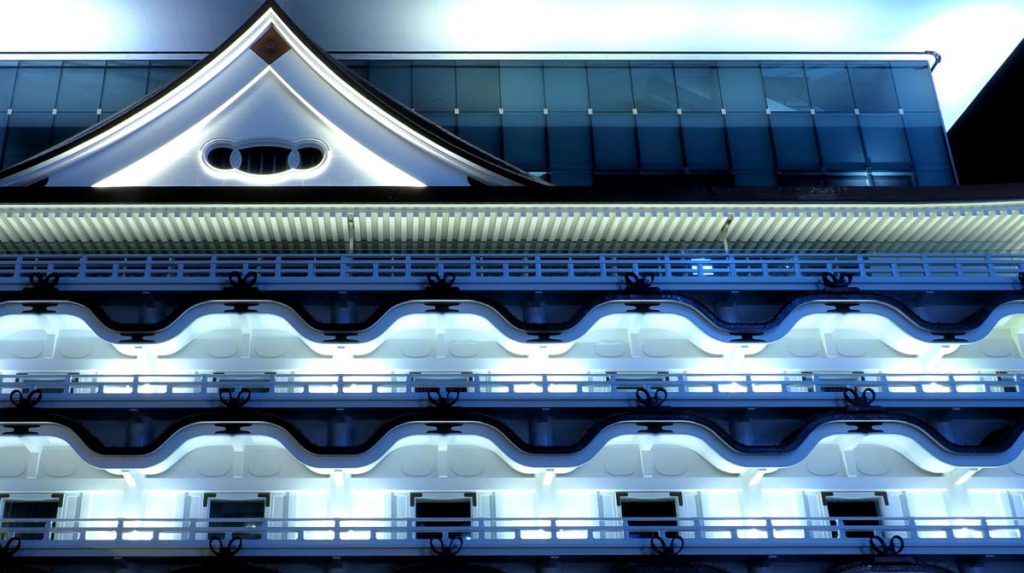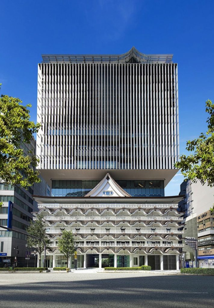 原本的「新歌舞伎座」建築屋簷採用日本常用於神社的「唐破風」傳統設計,獨特的尖塔展現出恍若名城的氣勢,下方四層延伸出連綿起伏的波浪線條,50 多年來陪伴大阪人觀賞各式傳統表演。直至 2010 年因建築過於老舊,舞台才遷至其他地方營運。原本的建築由於太舊而需重建,隈研吾卻很希望保留這優雅的老建築。因此,他的團隊利用 3D 掃描技術,保存建築數據,再依照記錄運用預鑄混凝土和鋁板材質重新建造。