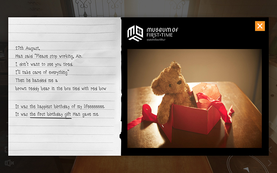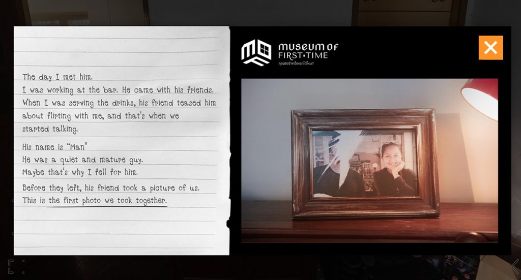 故事都發生在泰國,但“Museum of the first time”是以網上虛擬實境形式,帶你「走」進博物館,也就是一個家。一個叫做“Air”的女人會帶你游走暴力家庭的每一間房間。點擊“Air”介紹的物件,她便跟你說出整個家庭暴力發生的起始和過程。從第一份禮物,到第一張情侶合照,到第一次承諾,到第一次暴力。通常,暴力發生過後,他們會答應改變,會說這是一次錯誤,求她原諒。然後,便有更多次。從恩愛到暴力,每一個故事都發人深省。