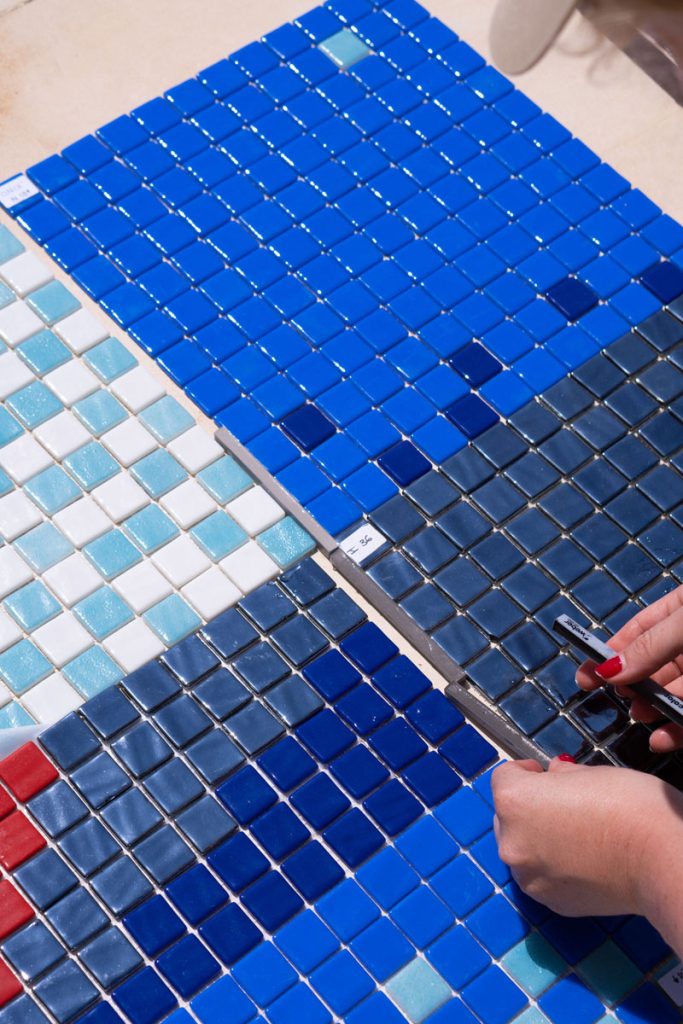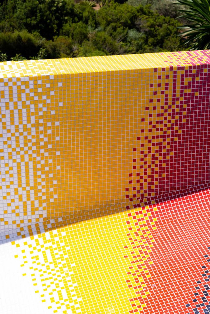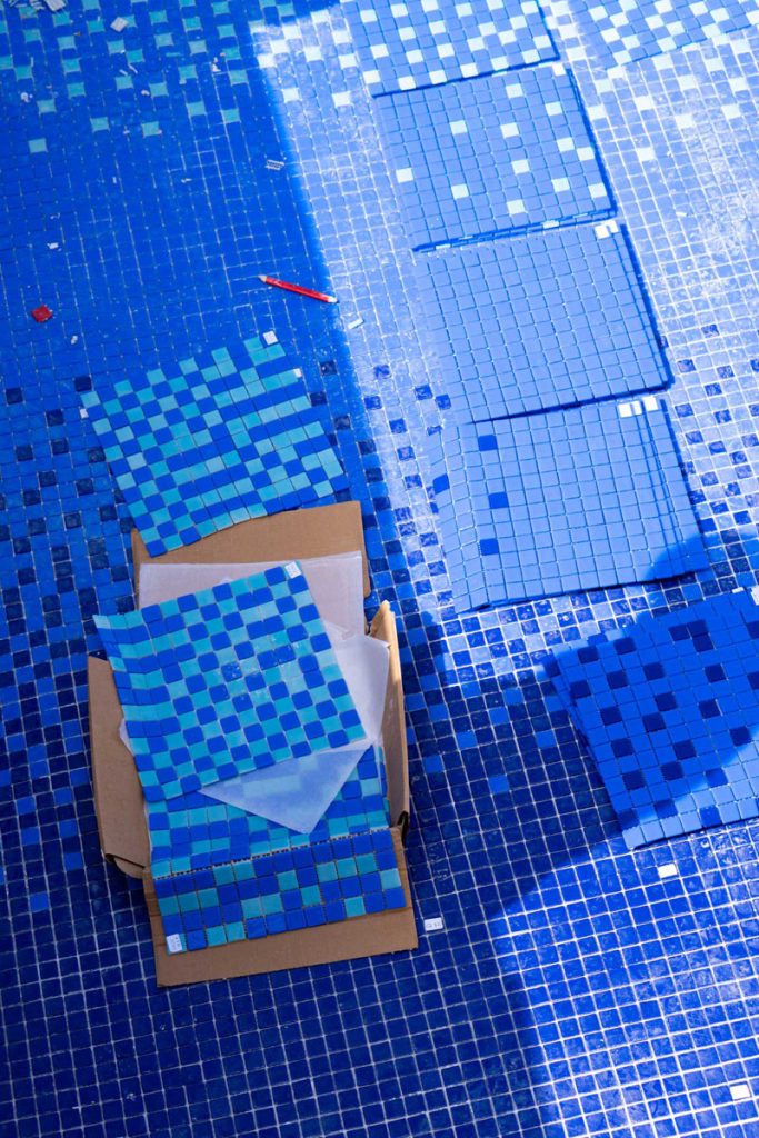 顧及泳池實用性和安全性,Felipe 施工前先與工程師運用電腦估算泳池尺寸和結構,再按精確的數據進行圖像設計,最終排列出以「黃紅藍白」為主調的漸變磚塊色盤,才正式動用人手排磚。
