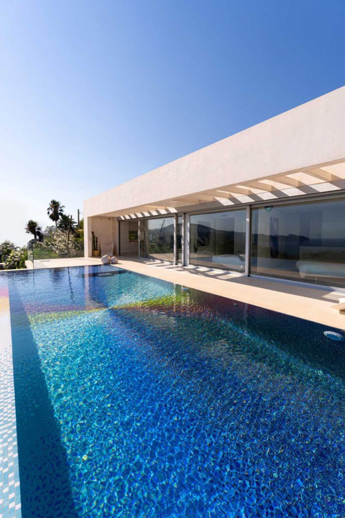 泳池運用大片幅的藍白磁磚營造寧靜氛圍,中央則置入呈放射型的紅黃磁磚,創造延伸至每個角落的漸寬光束。不注水時,圖案搶眼;注水後,磁磚跟水光則宛如寶石般,映照出迷人閃耀的光彩,跟純白房子和四周風景互為映襯,使人萌生躍進水中暢泳的意慾。