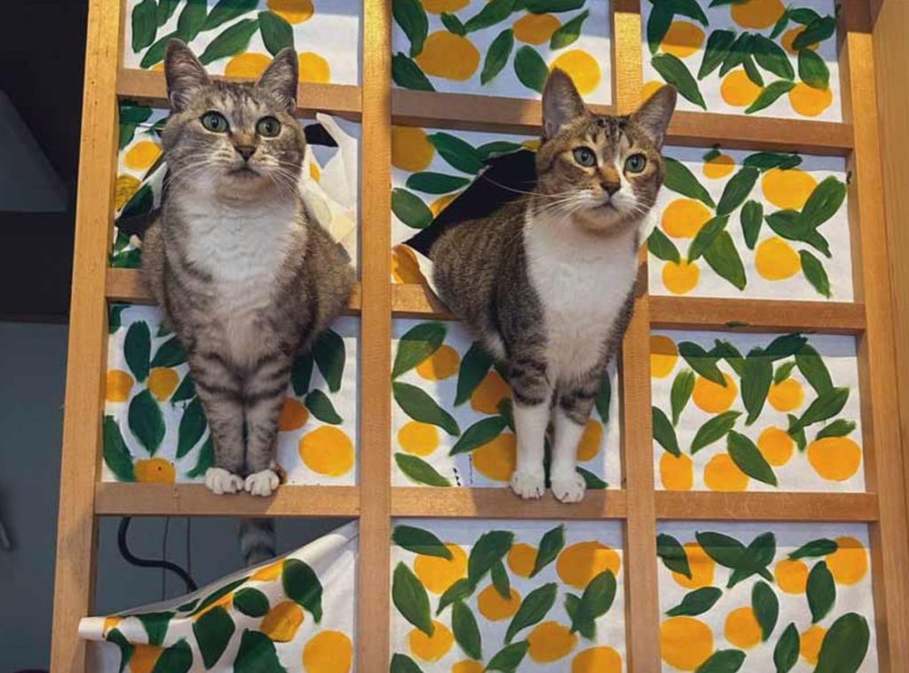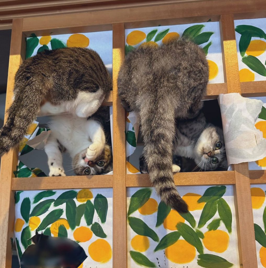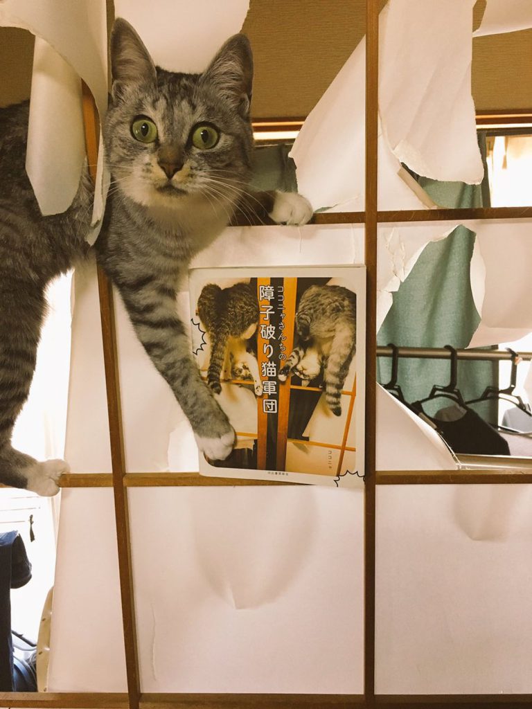 深陷破壞與修復的循環,ココニャ 無疑頭痛,但看主子們搞搞震得快樂,他終究不捨得責備,還開始幽默地選用不同花紙修補,再趁牠們破門時層出不同的戇態,並於 2017 年將照片輯錄成《破障子貓咪軍團》,當作雙方的集體創作般欣賞。