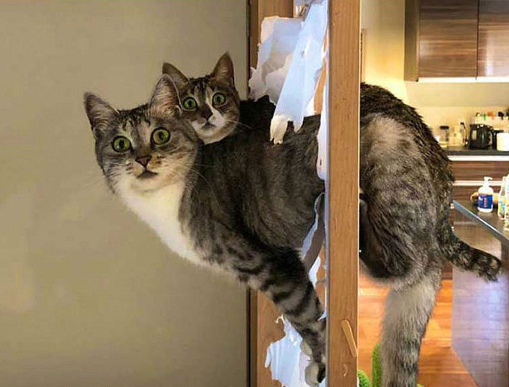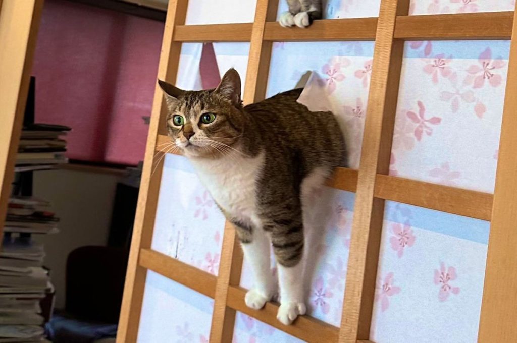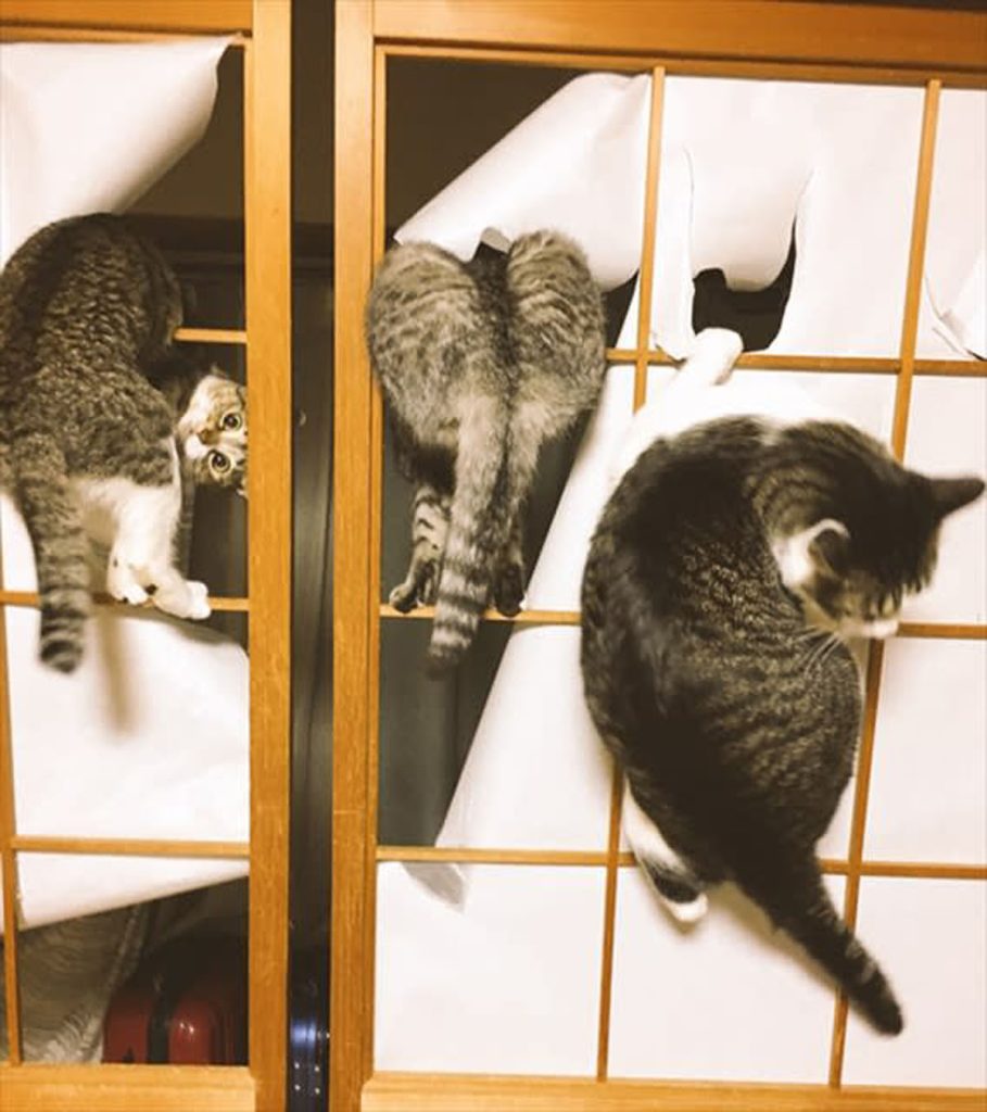 「是好奇吧?」ココニャ 猜想。直到某日,他發現紙門穿了一個洞,剛夠一隻貓咪通過,心感不妙;幾經觀察,洞口又增加,還目擊貓咪們興奮地穿破和紙,就知道這裡已變成牠們的「遊樂設施」!往後任其怎樣反覆修補,貓咪們總會反覆從不同位置破紙門而出/入。