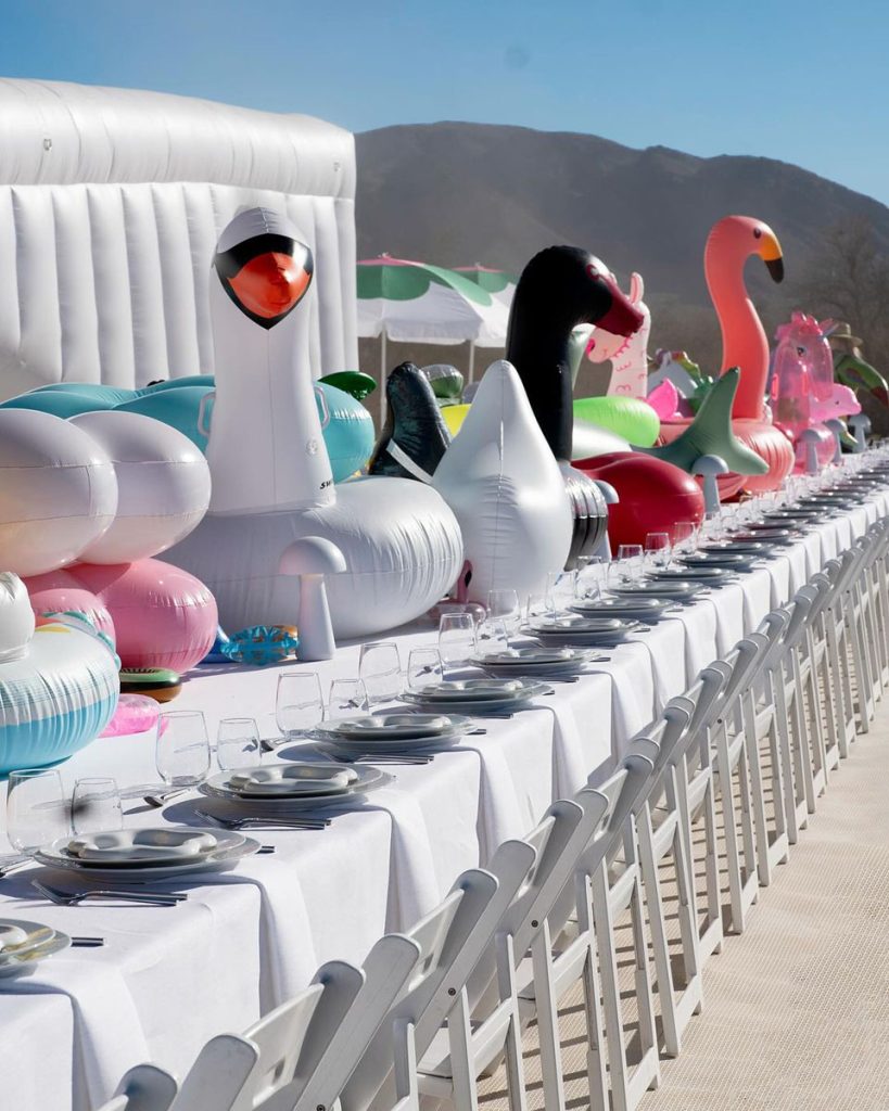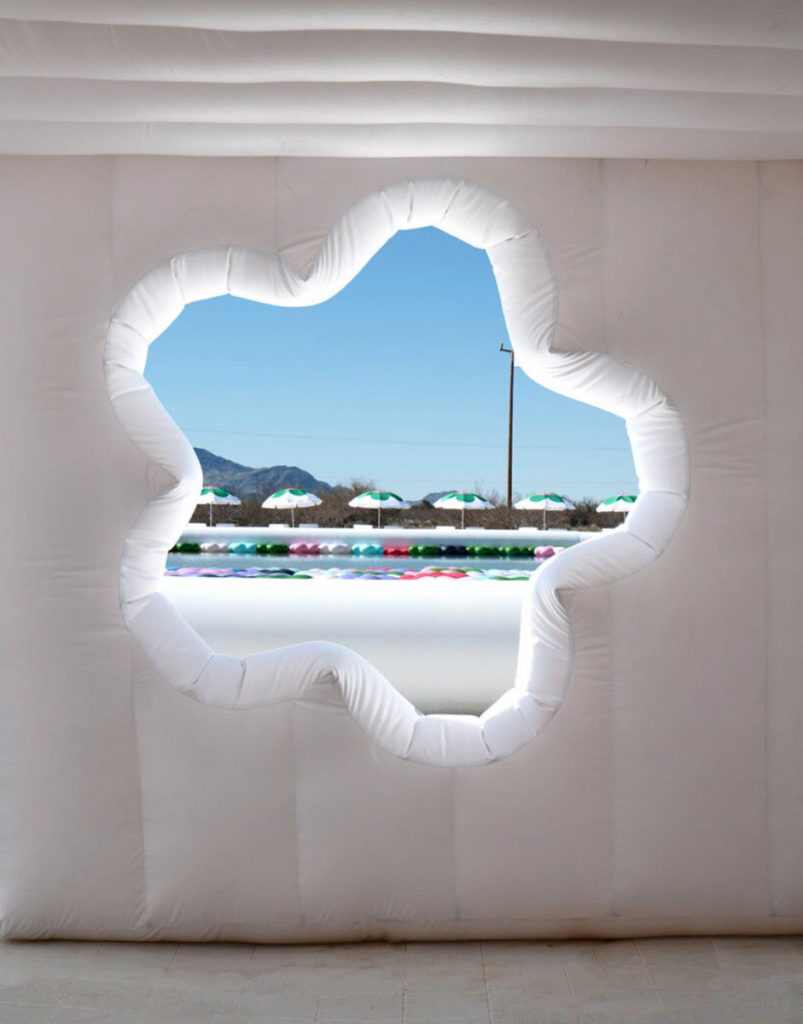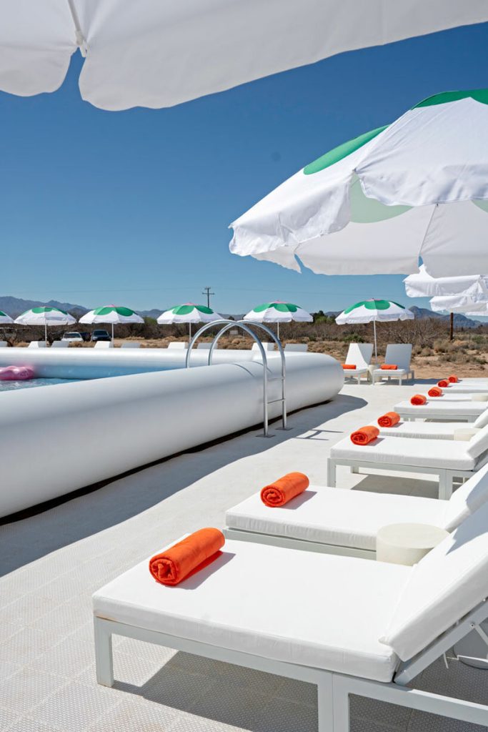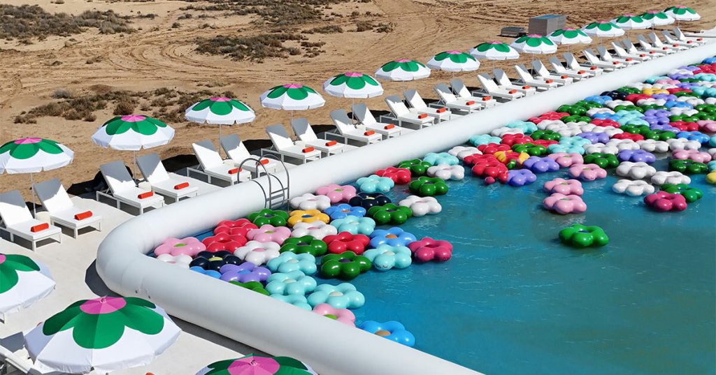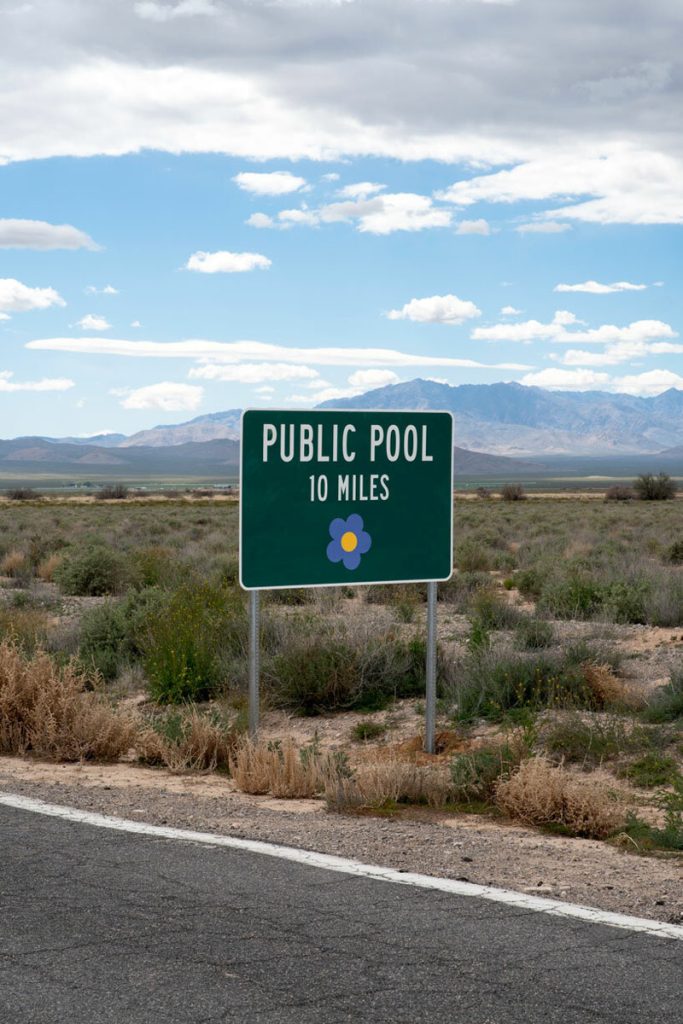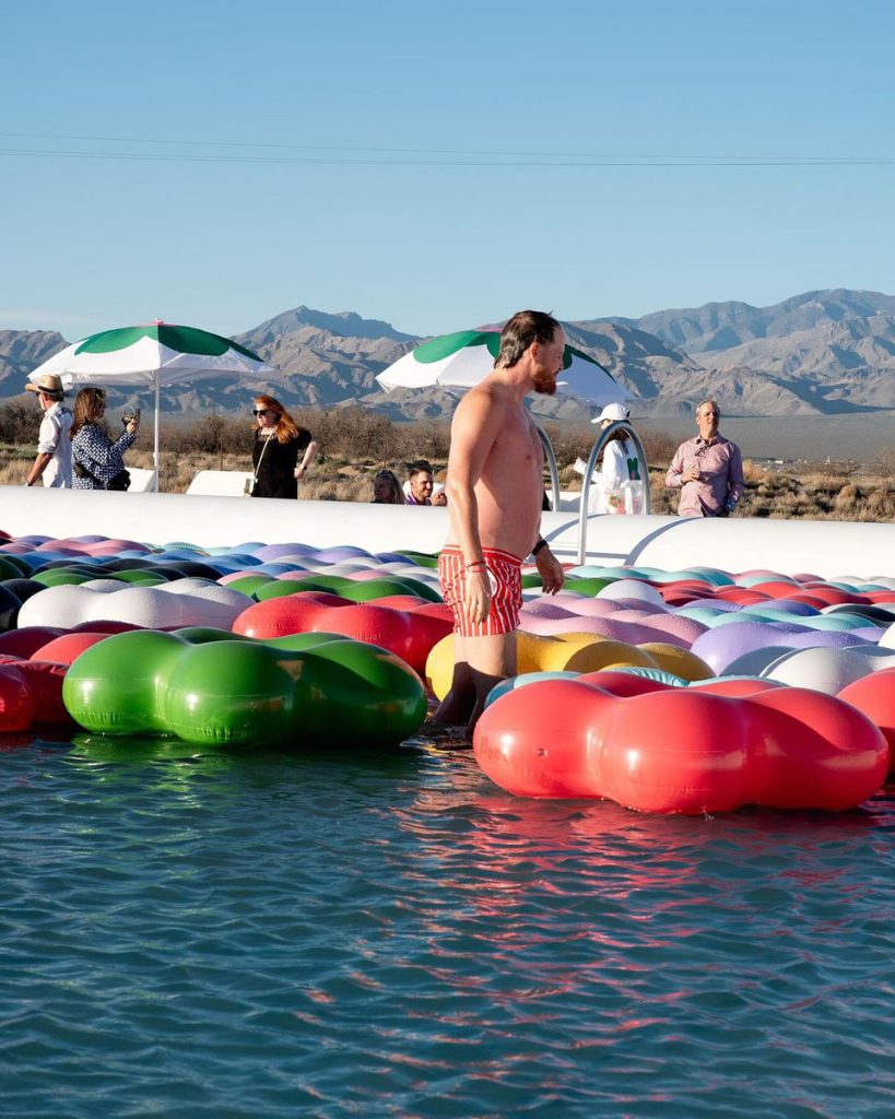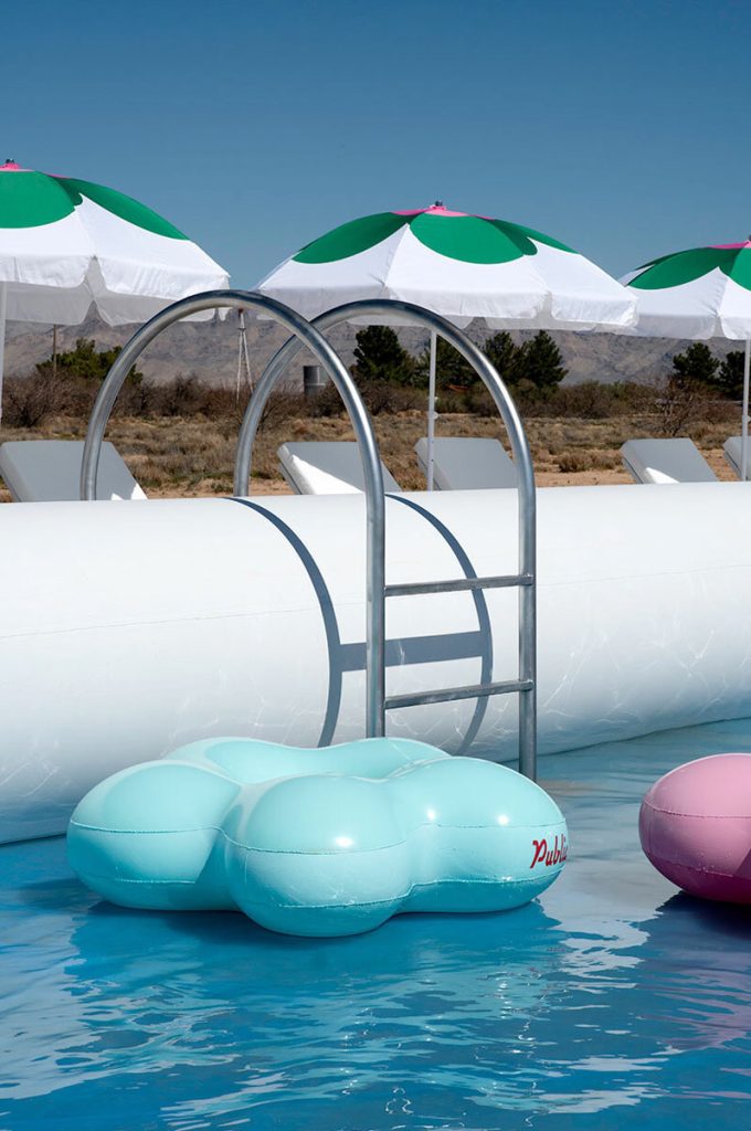 《Public Pool》是另一次奇幻挑戰。Cj Hendry 和團隊花近一年,走訪美國境內約六處荒野,選定「博彩之都」拉斯維加斯所在的內華達州,鄰近 Sandy Valley 牧場外一處百里的荒蕪地帶進行企劃。團隊先於空地搭建巨型的露天充氣泳池,再向僅三英尺深的泳池注入清水,投進藝術家創製的繽紛花型泳圈,然後圍着池邊安放一整排沙發躺椅。