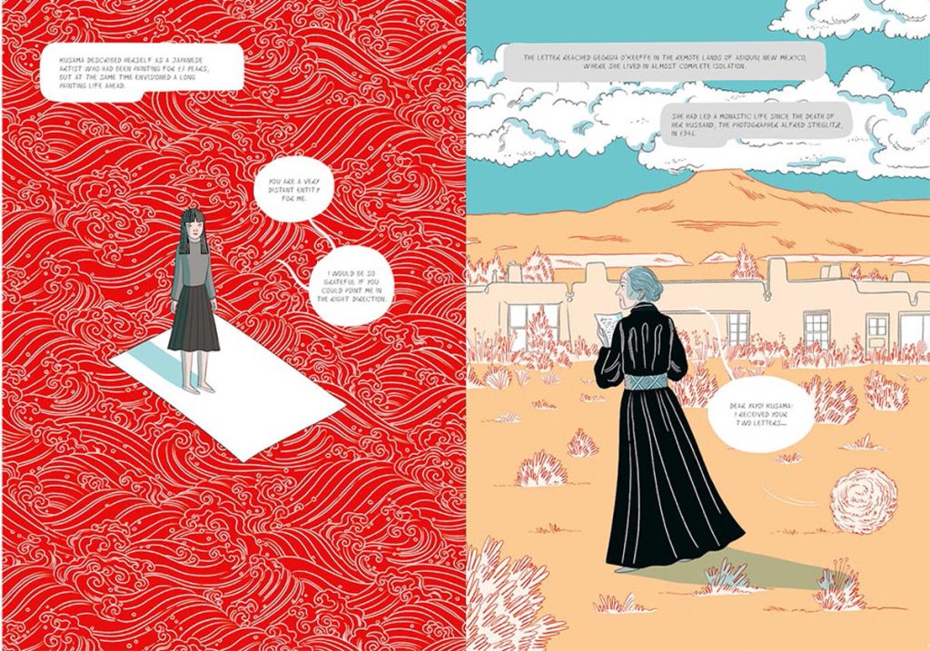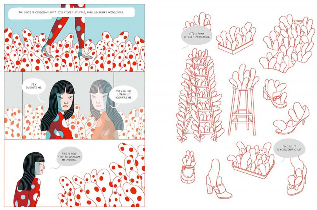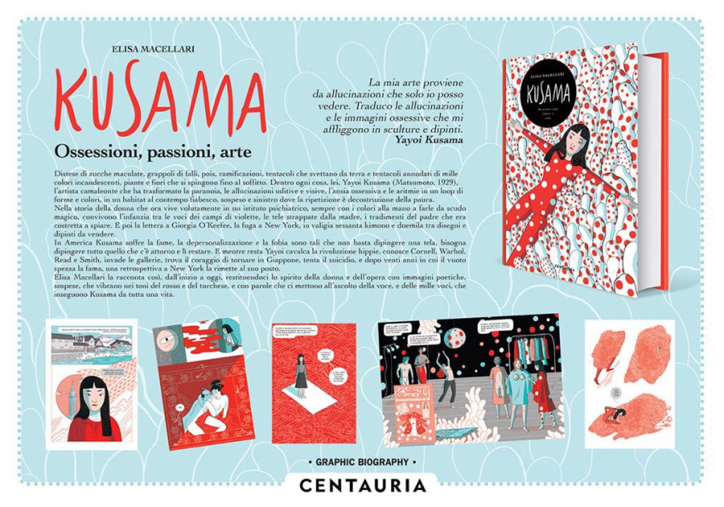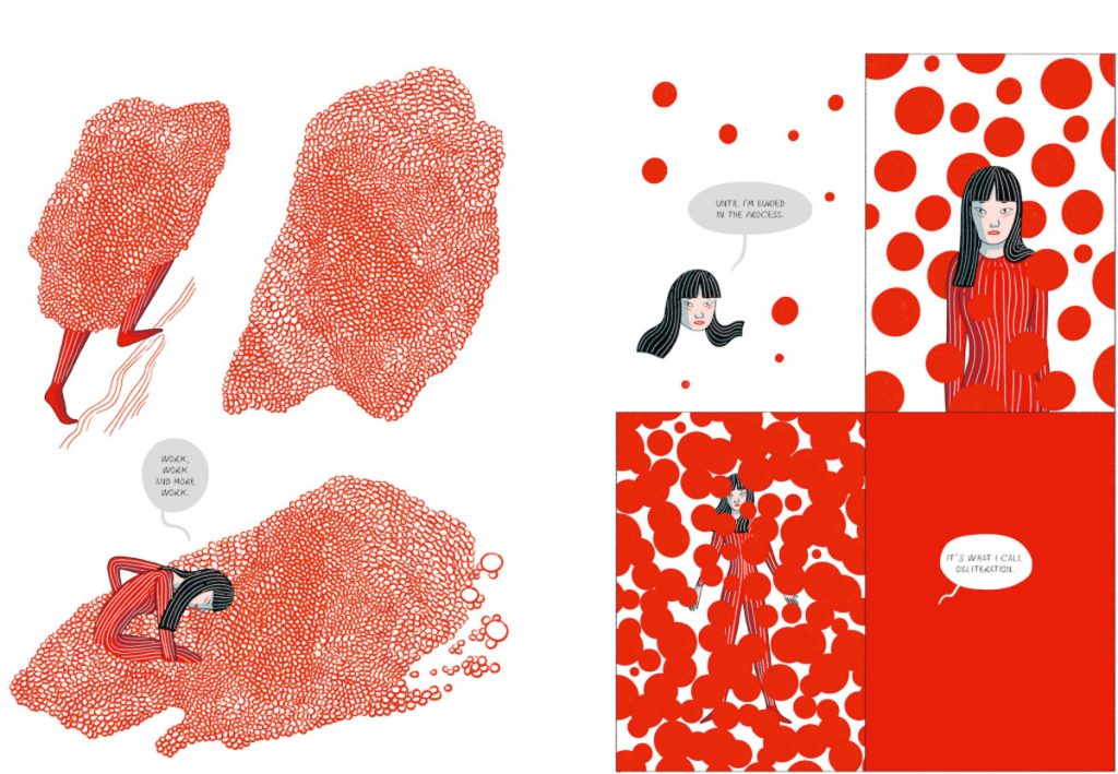 Elisa參考草間的自傳《Infinity Net: My Autobiography》和 紀錄片《Kusama: Infinity》(2018年)為藍本,繪畫出全書合共128 頁、涵蓋 400 幅插畫的《Kusama: The Graphic Novel》。書中,Elisa還特別採用草間的經典標誌「紅白色波點」,配上分鏡式插畫及簡潔色彩,精準地重塑出藝術家生命中多個關鍵時段。