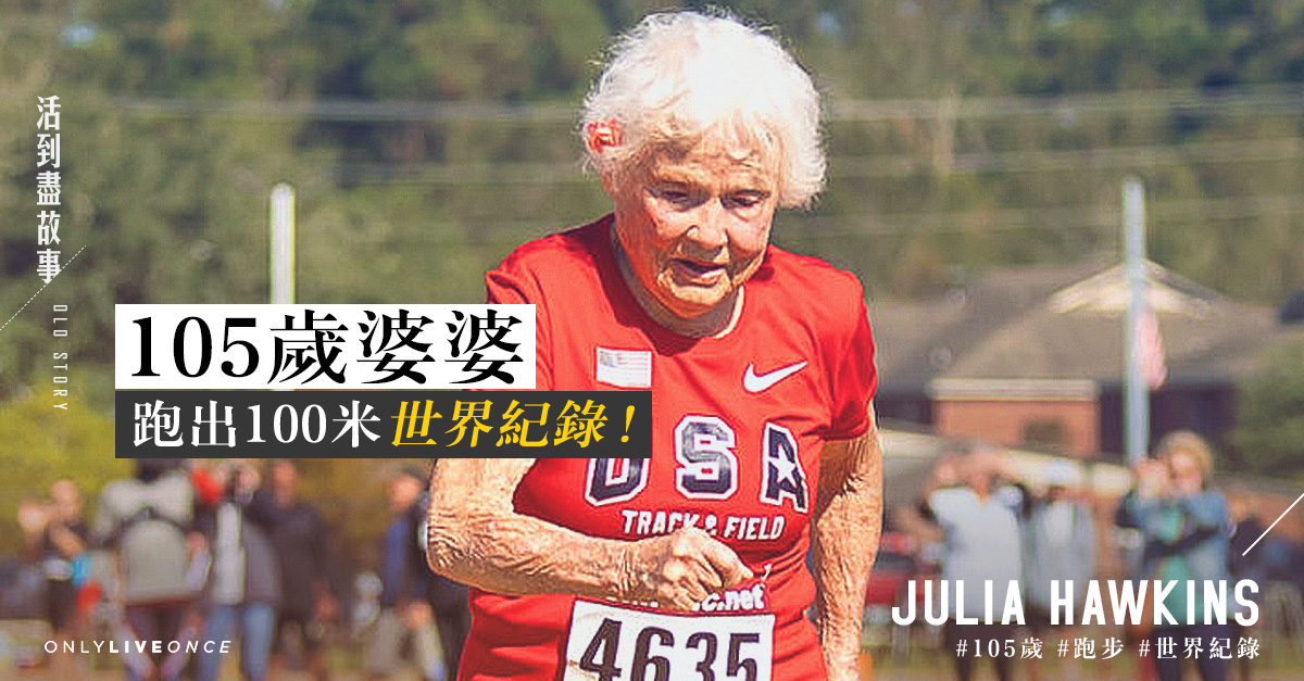 這位婆婆太厲害。美國的 Julia Hawkins 於 1916 年出生,今年 105 歲,在剛過去的路易斯安那州舉行的「全國高齡運動會」(Louisiana Senior Olympic Games)百米賽事中, 跑出了 1 分 02 秒 95,破了世界紀錄!