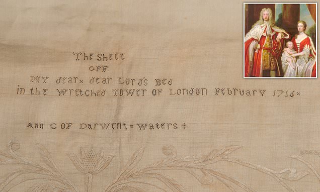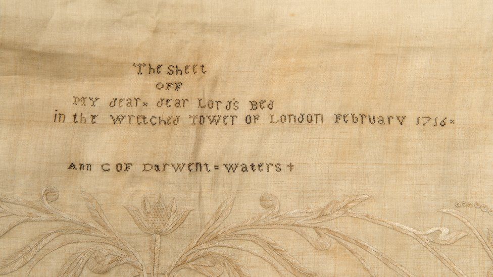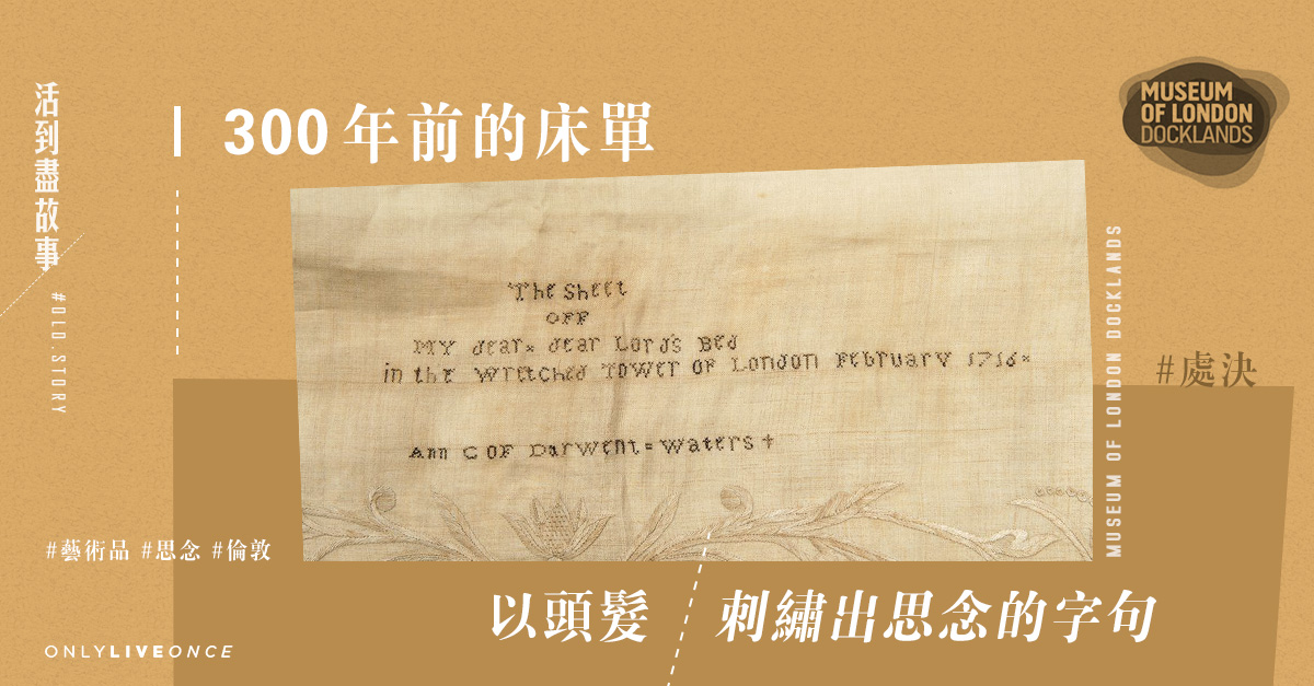 倫敦碼頭區博物館 (Museum of London Docklands) 將舉辦以「處決」為題的展覽。當中一幅作品引人入勝,那是一張床單,該屬 300 年前。泛黃的床單,繡著花、葉,專家估計這床單該用上數年來製作。獨特之處是,床單的一角以頭髮繡著字句,”The sheet OFF MY dear Lord’s Bed in the wretched Tower of London February 1716 x Ann C of Darwent=Waters” / 「這是來自我親愛的主人,在淒滲的倫敦塔內的床單,1716年2月,德文特沃特的安娜」。