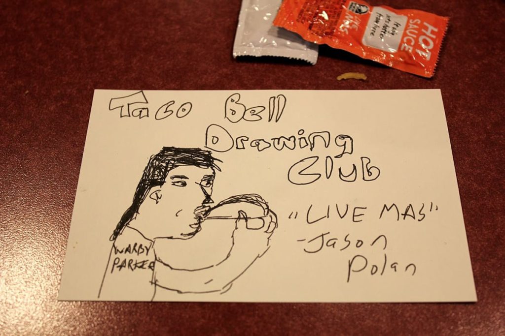 Taco Bell Drawing Club 被譽為「全球最大型自發性繪畫組織」,惟 Jason 所訂的會規卻隨性。組織基地 Taco Bell 非名人場所,只是一間位於紐約聯合廣場附近的連鎖速食店;每星期 Jason 有一日到店繪畫,誰自問愛繪畫即可聯絡;期間大家不用繳會費或社交,亦不講究藝術背景或技巧,當「俱樂部」牌子掛上,無論是企業老闆、司機、師奶或小孩等,皆可同坐一室自由創作,成品內容多元又有趣。