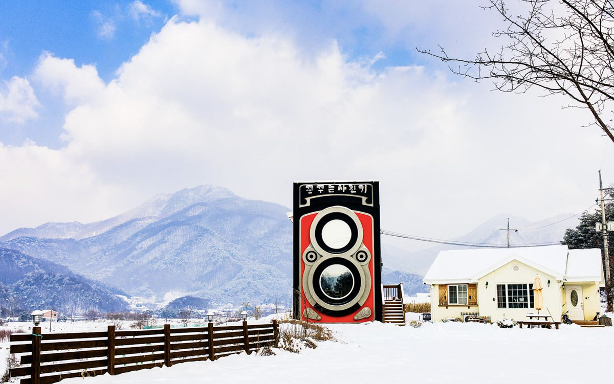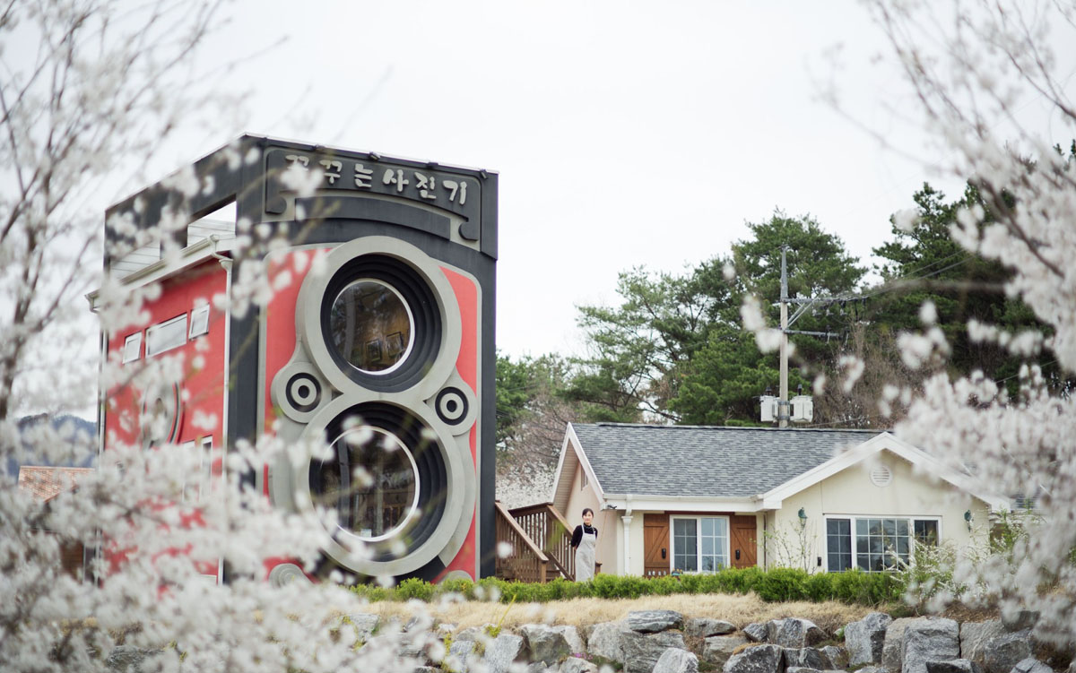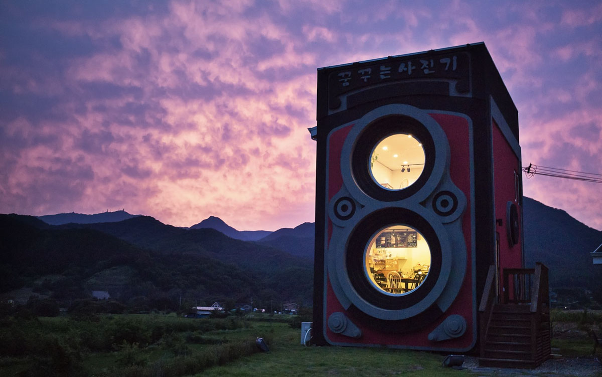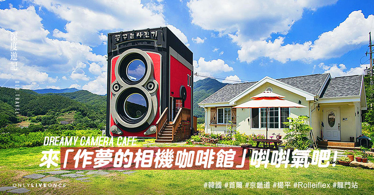 於繁華的首爾乘地鐵前往「龍門站」,出站後轉乘的士前往山丘田園,即可看到這座外形醒目的咖啡館——餐館外形被愛攝影的老闆,建成經典 Rolleiflex 雙鏡頭相機模樣,不僅外牆髹有奪目的紅色,牆身還模擬了快門按鈕及聚焦輪等細節,樓頂又鑲有店名「꿈꾸는사진기」,方便訪客一望而知,非常細心。