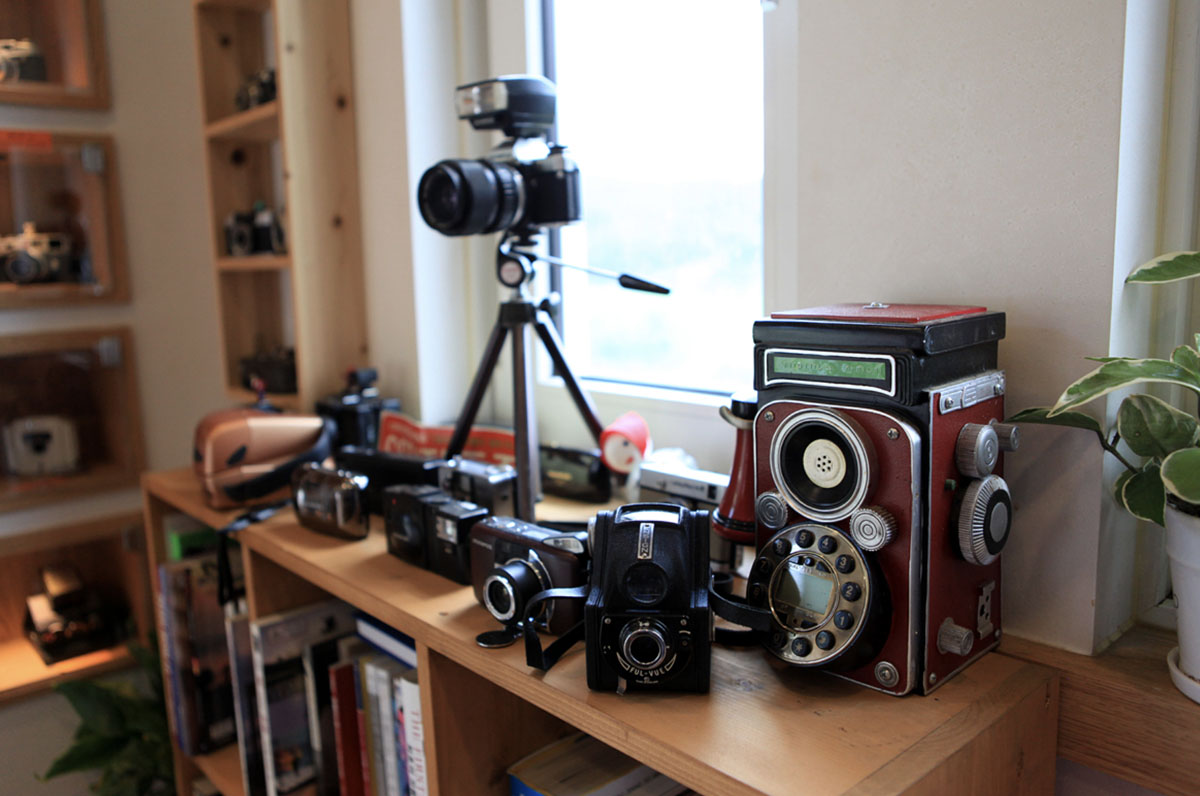 當然,個性沉靜的訪客,亦可選擇安靜細賞館內佈置。從吧檯區隨意張貼的家庭照,到窗台及梯間陳列的 Leica、Lomo 和 Pentax 老相機,以至二樓書架上擺滿的多國攝影書及底片盆景角落等,大大小小的元素,交織出溫暖與專業並存的氛圍。