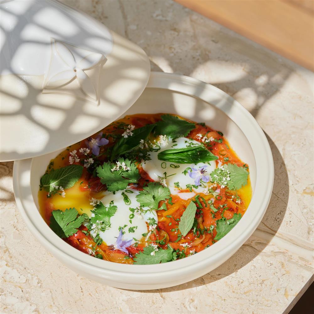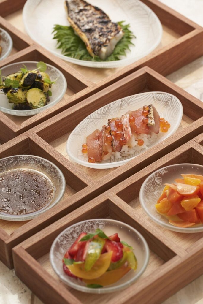 針對品牌的創新精神,主廚 Mory 參照個人生於法國、擁有馬利與塞內加爾血統的多元背景,為這所位處聖特羅佩酒店 White 1921 的新餐廳,設計了一系列融合日本、法國及非洲風味的獨門料理。例如啟發自鐵路便當的「ekiben」,於特製的木盤分隔中載入玻璃容器呈現夏日風味,並綴以永生花、葉片作裝飾;晚餐材料豐盛之餘,也充滿異國風情元,既有加入味增的沙律醬、素食茄子玉米餅、烤鰤魚、小龍蝦、頂級牛排,又有滋味濃郁的北非 Tajine 料理、生茴香芒果沙拉及煙燻大蕉等,加上烙有 LV 招牌 Logo 的小巧甜點,從味道到擺盤,都引領饕客展開一場舌尖上的獨特旅程。