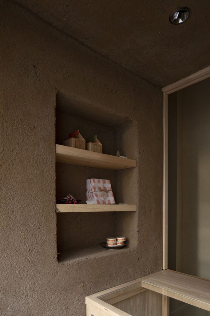 有別於前三間分店的極簡,建築團隊加強四丁目店的「有機性」與「靈活度」。位於街角的地舖,不設座位或閒逛區,讓烘焙師和店員經門面的特大櫥窗,為顧客提供購物及查詢等服務;全店採用厚實的凝土和紅棕色為主調,貌似可麗露的脆皮,乍看可愛,配襯和紙職人畑野渡設計的暖簾及綠意植栽,還有店員的親切招待,來賓仍可獲得窩心的消費體驗。