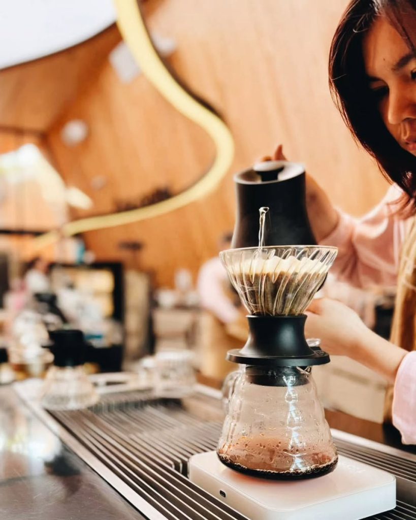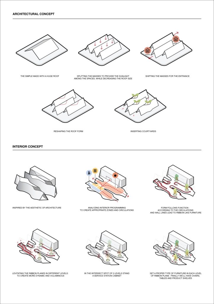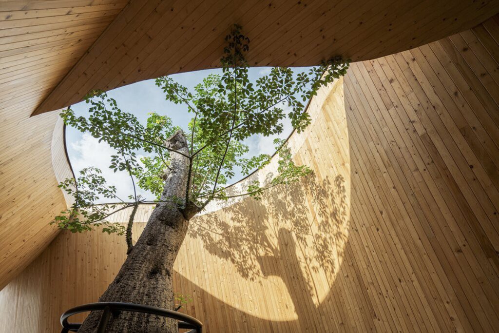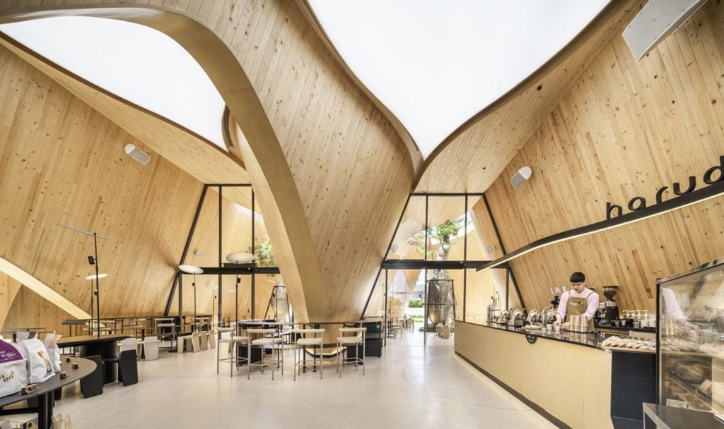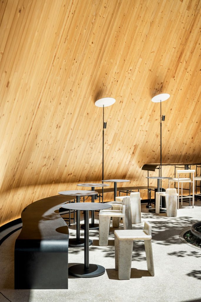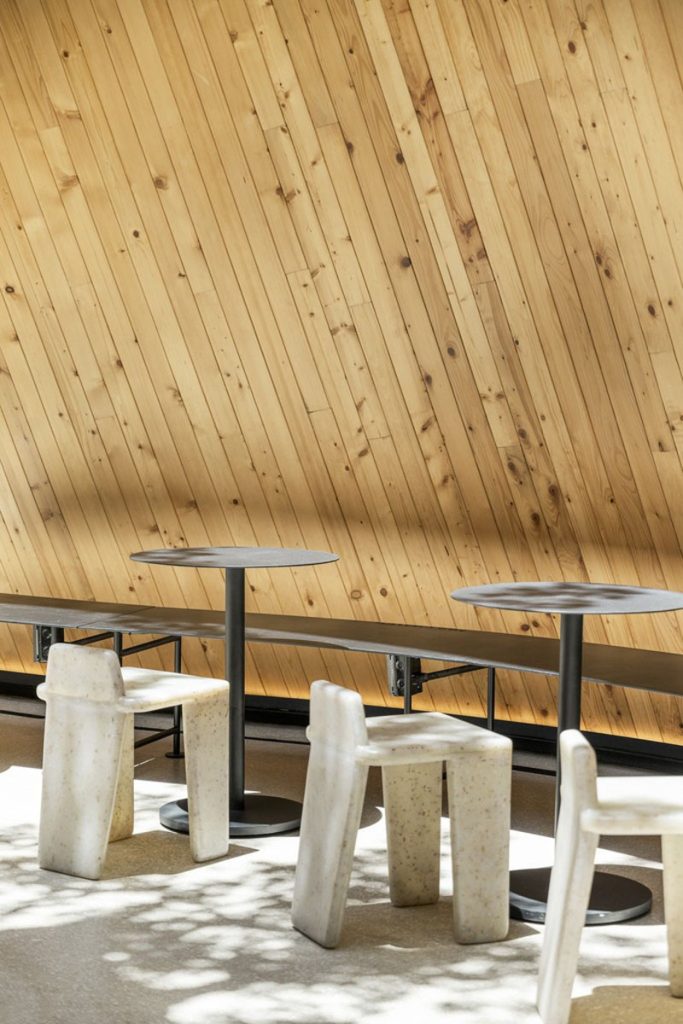 三座山牆建築與內部相連,劃分成酒吧、咖啡飲用區及休息室等;光滑的水潤磨石地面嵌有弧形路標,指引顧客沿動線前行;櫃檯和一般座位的高低配置,可適應不同功能,座椅由樹脂融合咖啡渣、米和樹葉製成,非常環保。隨時間流動,觀看店舖與樹木的變化,可感生命的奧妙。
