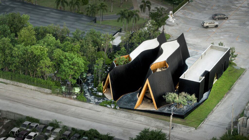 建築團隊聚焦欣欣向榮的意念。將咖啡店想像為「山脈」形態的溫室,將建築底部撐開、拉出讓道,並於頂部開出天窗,使內部庭院種植的巨型猴麵包樹,可穿越半露天空間向上生長。咖啡店外部則規劃成三組綿延的黑色山脈,使之融入周邊地景,內部則選用溫暖的松木形成對比,令觀感型格中不失自然。
