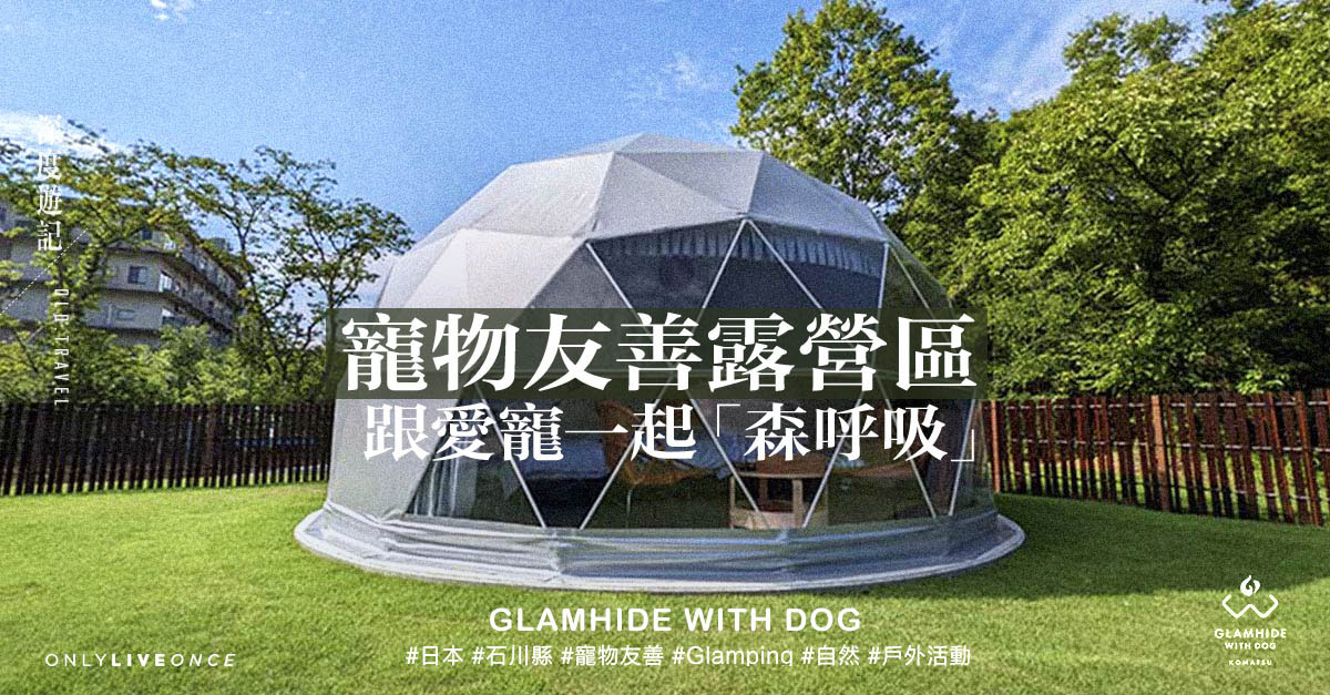 秋意漸濃,又是露營好季節。隨寵物家庭帶同毛孩出遊成新趨勢,不少旅宿陸續倡導「寵物友善」(Pet Family)服務,最新開幕的石川縣豪華露營區「Glamhide With Dog Komatsu」(下簡稱Glamhide)就是專為狗狗們所設計的旅行場所。