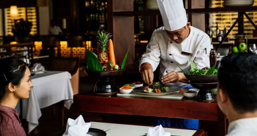 酒店以美食藝遊劇場復興傳統文化,引領旅客邊觀賞談柬埔寨歷史的皮影戲劇,或其他鬥獅拳、高棉武士武術等表演,邊品嚐名廚主理的皇家級高棉料理,如白馬蟹餅、湄公河鼇蝦湯和薩拉曼咖喱羊腿等,層層遞進地了解當地民族智慧。