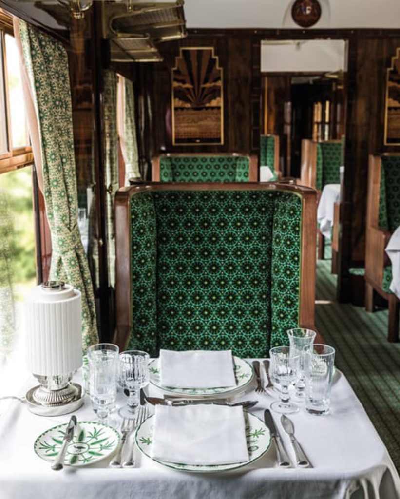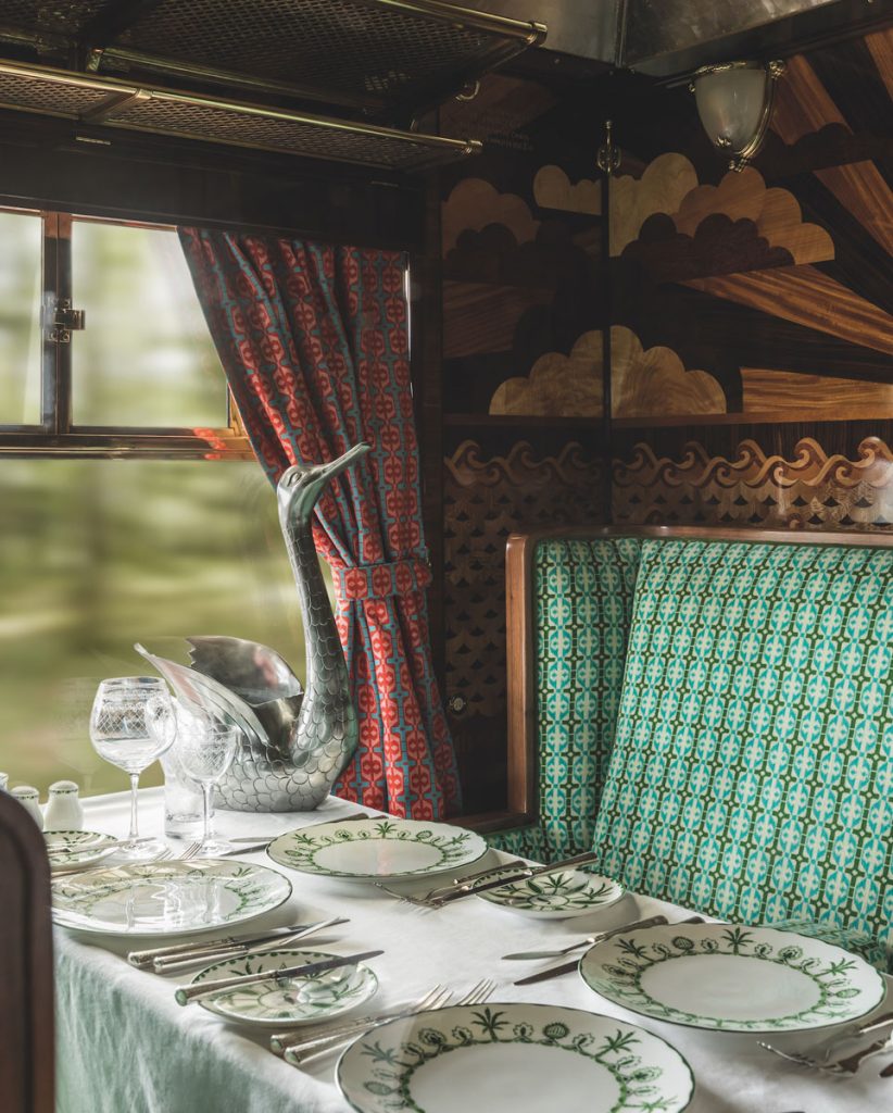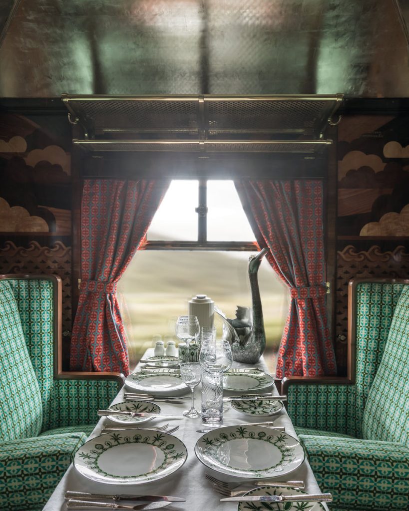 隆重其事,Belmond 誠邀了名導 Wes Anderson 專責 Cygus 的設計。Wes 素來喜於個人電影中置入火車遊情節,今回他也專程給 Cygus 增添電影場景元素,例如於車廂天花板中央嵌入粉蠟色面板,跟深淺有致的綠色印花地毯和座椅,形成對比;椅子和鏡子又選用線條銳利的款式,符合其對角度平衡的追求;車廂壁面木板,又鑲嵌陽光、雲彩、星星和波浪圖案;車廂內,還添置不少跟天鵝有關的細節,呼應車廂名稱與往事,從視覺到寓意均氣派非凡。當旅客身處復古車廂中,享用客座廚師烹調的豐盛晚餐,想必有種時光倒流到黄金時代的既視感,獲取難忘體驗。