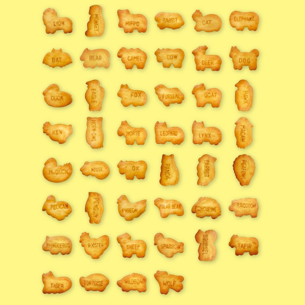 起初,小動物餅乾如孩子們的第一本「動物百科」。早期僅得「紫菜口味」,全部動物造型的餅乾共有 47 種,又名「動物 47 士」,每一盒約包含十數款種類。而每一塊餅乾上,均會清晰標示該種動物的英文名,盒子後方則羅列所有日英譯名作對照。當兒童消費者品嚐美味之時,也可被同步觸發求知慾,請教爸爸媽媽相關動物資訊,促進親子交流。