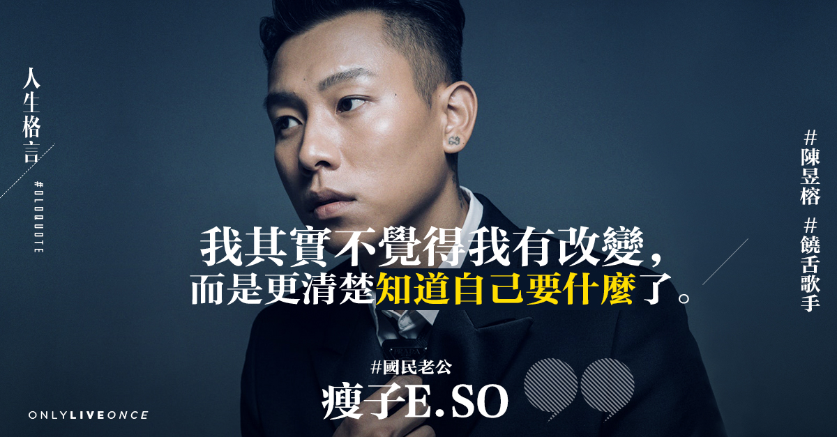 本名陳昱榕的台灣饒舌歌手瘦子 E.SO,是台灣的「國民老公」,也被稱為「行走的費洛蒙」。這位大家中心的完美男神,魅力不只於帥氣的外表,更是對世界和生命的思考。