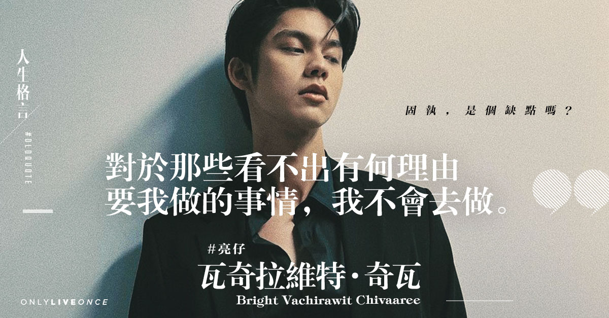 泰國新人 Bright Vachirawit Chivaaree 笑言自己也曾被說過固執,但他這樣理解:「其實和我共事的人不會覺得我固執,是那些無法給理由的人說我固執。」他分享到一個兒時例子:「小時候,大人們想我專心讀書會禁止我玩遊戲,但我已唸了 3 小時的書,現在想玩 1 小時的遊戲,自覺得不會影響讀書,那我就不會聽他們說,沒人能禁止我玩。」