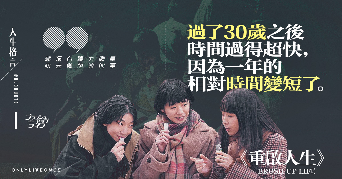 《重啟人生》中有一句名台詞,過了30歲之後,時間過得超快,因為一年的相對時間會變短。時間的長短是相對的,一個人在兩歲時,一年是人生的一半,但當一個人到了三十歲時,一年是人生的三十分之一,加上重覆的經歷與活得社會化,時間好像過得愈來愈快,回想上年好像甚麼也沒發生就過去,今年又差不多過了一半,自己也從三字頭變成三十多,甚至來到近乎四十歲的大叔、姨姨的年紀,時間只會相對地過得愈來愈快,趁還有體力,有膽量的年紀,快快去做想做的事,別到了滿身病痛時,才回想起甚麼也沒有做到。