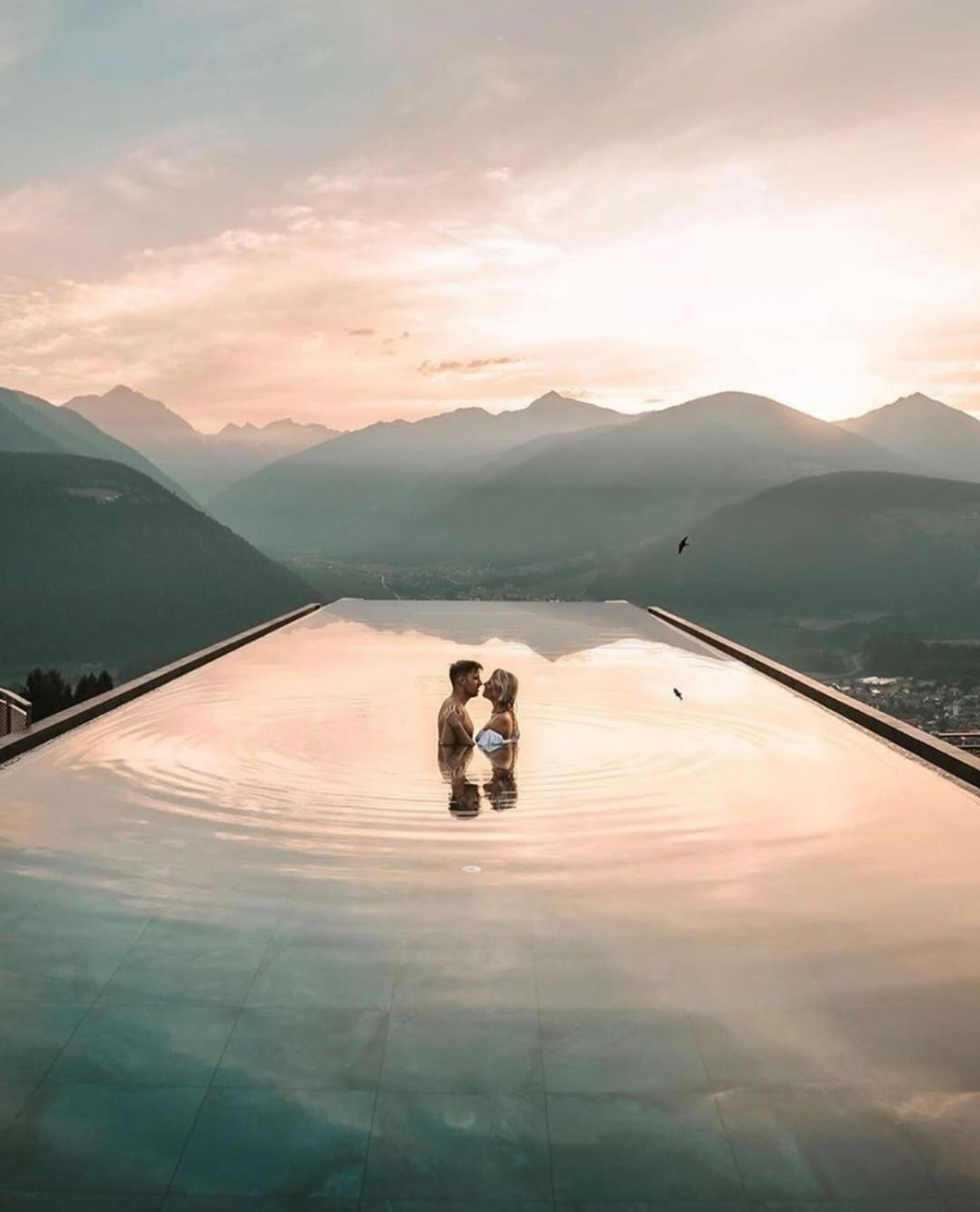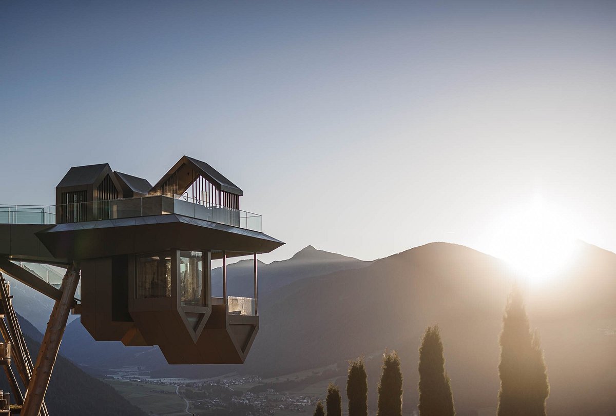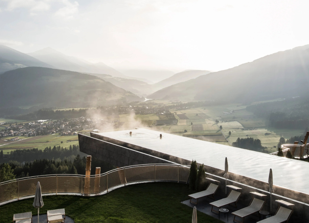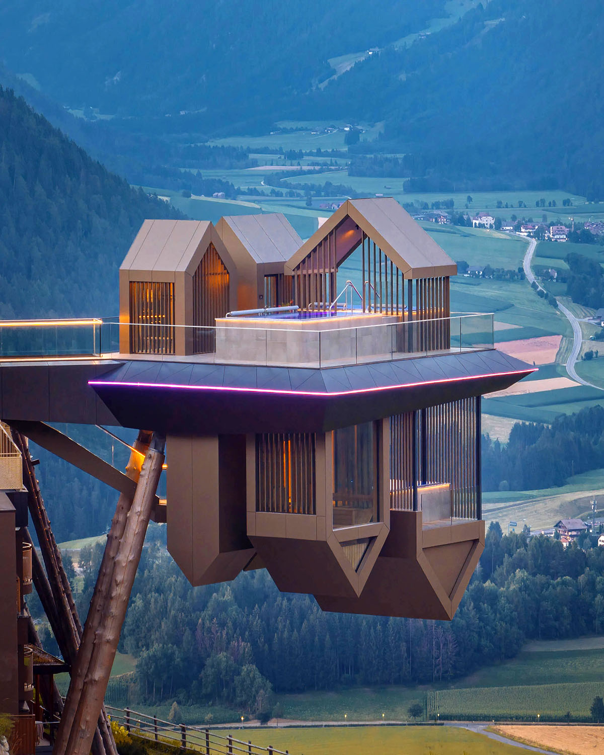 Hubertus 座落多洛米蒂山脈岩層之上,由五口之家 Gasser 營運。這家人深受建築迷兒子 Christian 啟發,於 2016 年左右接手其時僅屬於二星級的 Hubertus,並誠邀 noa* 建築事務所負責改建酒店,提供與別不同的住宿及建築體驗。團隊善用巔峰的地勢改建酒店,飄浮於雲霄的天際泳池 Sky Pool 是焦點。其底部非採用實心結構,以大片玻璃立面結合堅實的松木樹幹支柱,營成強大的通透感,讓泳者可超越建築與自然的界線,全然融入壯麗的風光中。