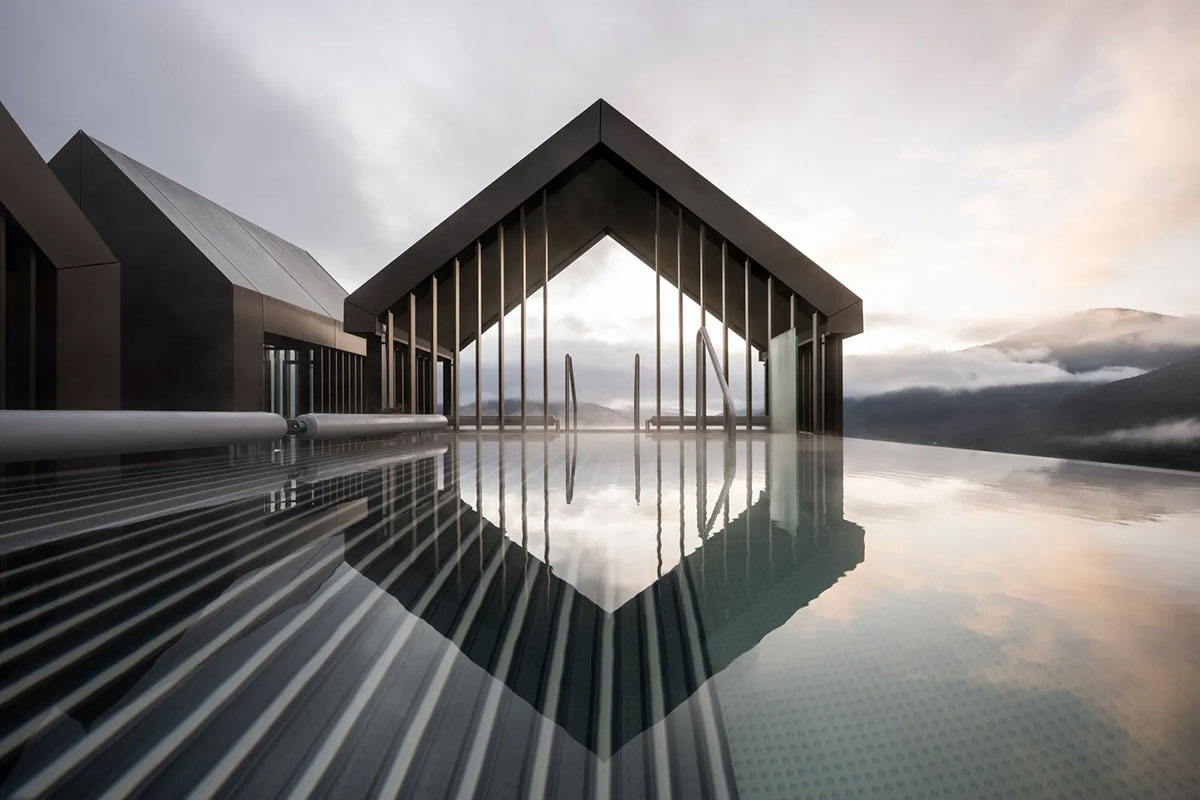 短短數年間,Hubertus 已躍升國際級酒店,Gasser 家族還趁疫情空窗期,再度請來noa* 團隊加建 Heaven & Hell 水療中心,以應付疫後旅遊業重啟的需要。本年度剛開幕的新樓層,建於酒店及泳池的平行方向,是一座以水元素為靈感的「垂直對應」山形屋建築,其「上下對倒」外觀乍看縱非完美對稱,卻有湖水互相照的意境。
