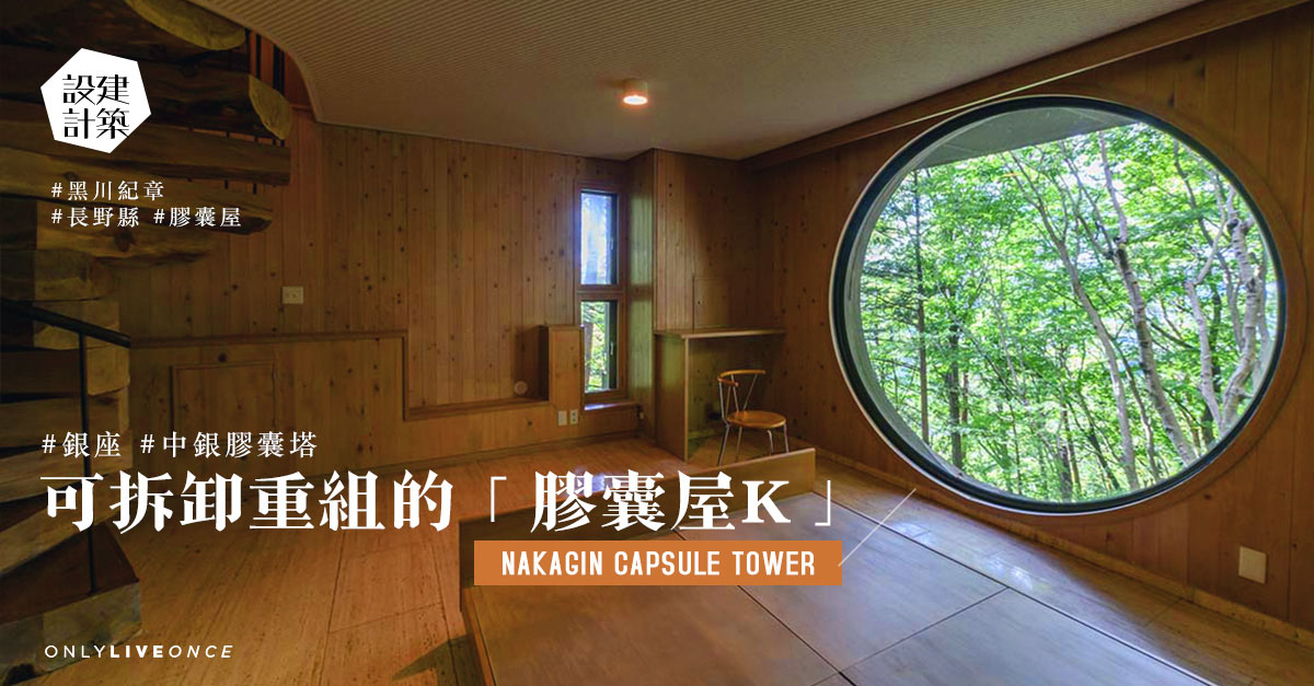 「膠囊屋K」迄今逾 50年,由黑川運用跟「中銀膠囊塔」相同的4個BC-25型膠囊建成。全屋以溫厚木材為基調,玄關有厚實製旋轉樓梯;客廳滿是木傢俱;兩間臥室,一間跟自然景緻融合,一間與廚房皆飾有純白設施,氣息摩登;茶室有和式榻榻米及竹編裝飾。除卻廚房採用長型窗戶,其他起居間皆用上標誌性圓窗。
