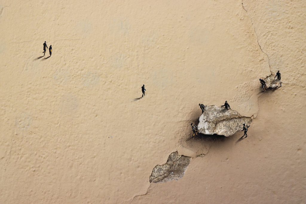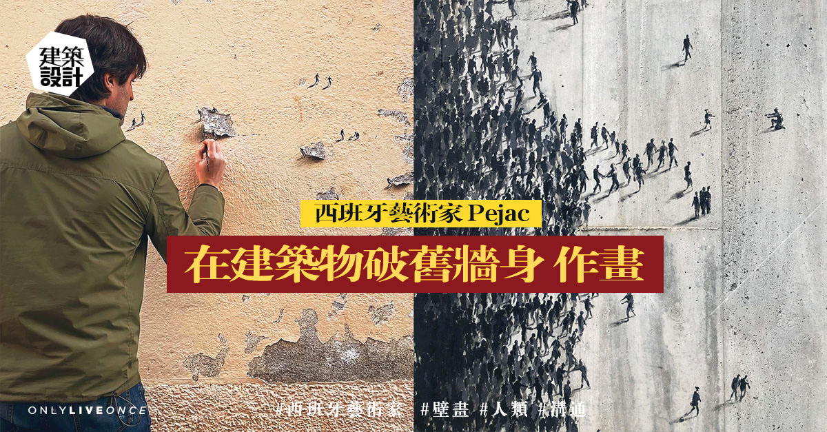 西班牙藝術家 Pejac 喜以城市舊建築外牆作「畫布」,但他卻非簡單用油彩塗鴉,而是擅長將牆上或斑駁、或剝落的形狀,配合剪影及錯視手法繪成另類壁畫,以詩意的視角引領觀者關注所在空間的狀況,以至社會民生現象。