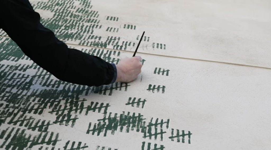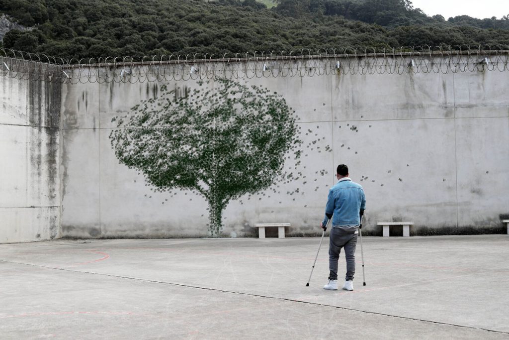 知名案例,可數 2019 年,Pejac 在西班牙最古老監獄 Penal de El Dueso,跟受刑人共同創作的戶外壁畫裝置《The Shape of Days》。這由遠看如鐵絲護欄下、自然生長的一棵尋常大樹,但當你近看卻會發現組成綠樹軀幹及枝葉的,全是「四豎一橫」的記日式符號,原來 Pejac 想借這些標記,象徵牆內的受刑人等待釋文的緊張,以及牆外家屬靜候受刑人重獲自由的期盼之情。
