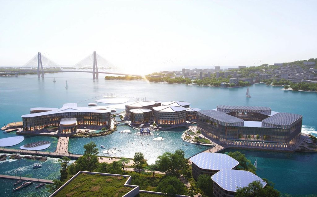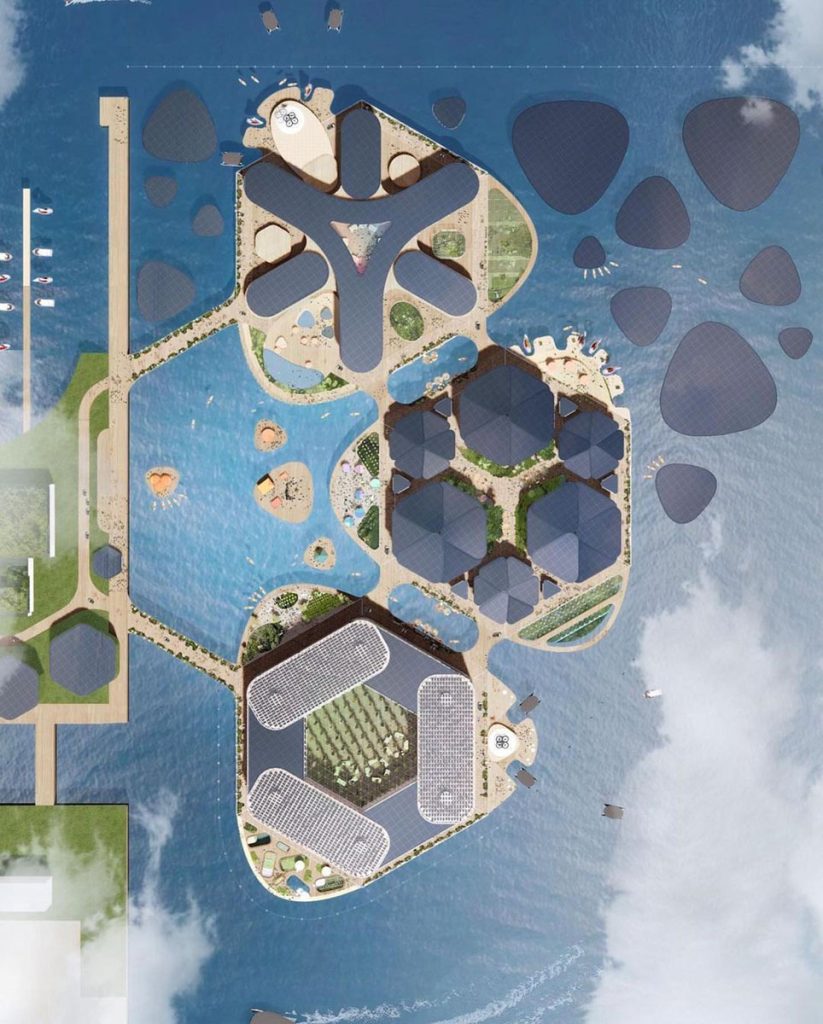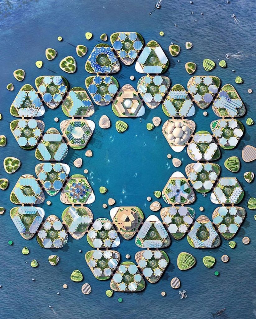 水上漂浮城市的原型(prototype)為面積約 15.5 英畝,可容納一萬二千多人,最特別是島與島之間可作延伸,一個一個模塊(modular piece)加建,以路橋連繫。島上的能源、水源和食物都是自給自足,廢物污水會循環再用。由於是建於海上,不再懼怕水位上升,解決了氣候變化一大問題。