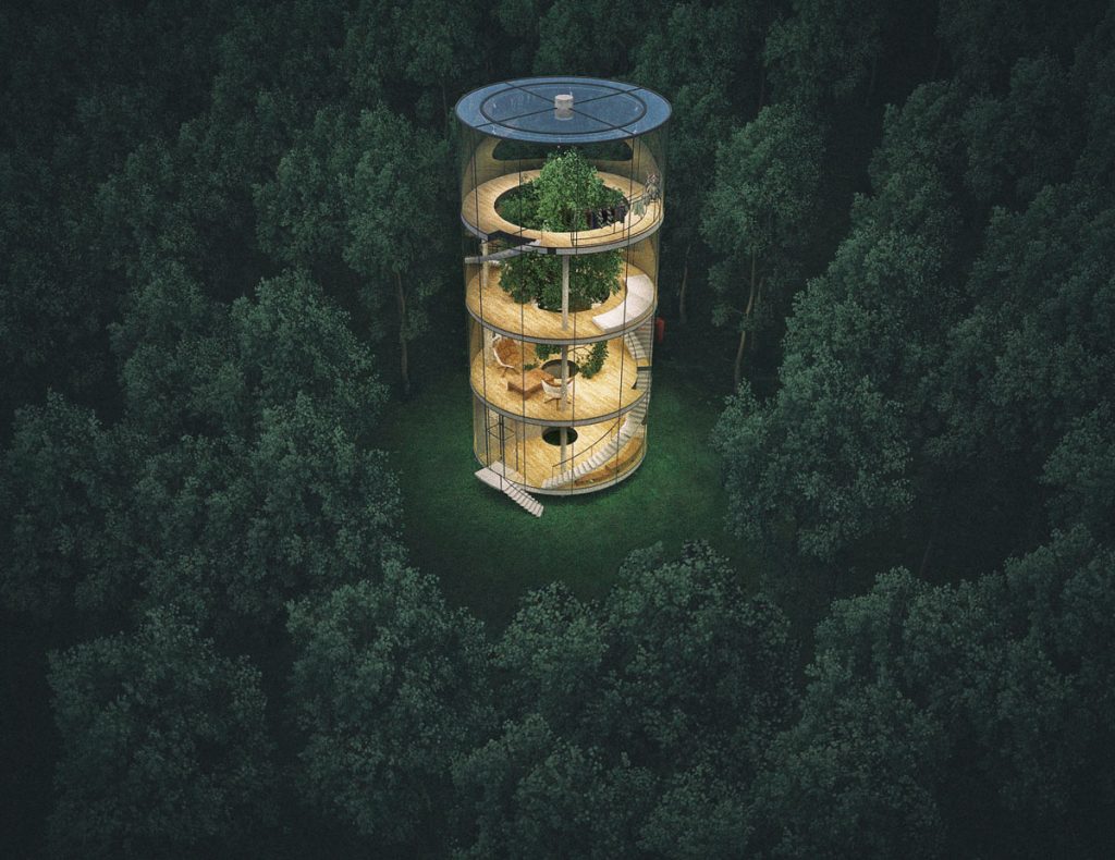 籌劃經年的建築概念項目「Tree in The House」,就是一幢顛覆固有思維,於森林中以不破壞環境的前題下的綠色之家。Tree in The House 外觀的玻璃建材,實則透明是太陽能電板,其於不需清除任何巨樹的構思下,反過來地以管狀形態依樹形而興建,繞着樹木的外部往上發展成四層高樓,將室內外的綠意、陽光與天空景致無縫融合,同時為住客提供 360 度的森林視野。