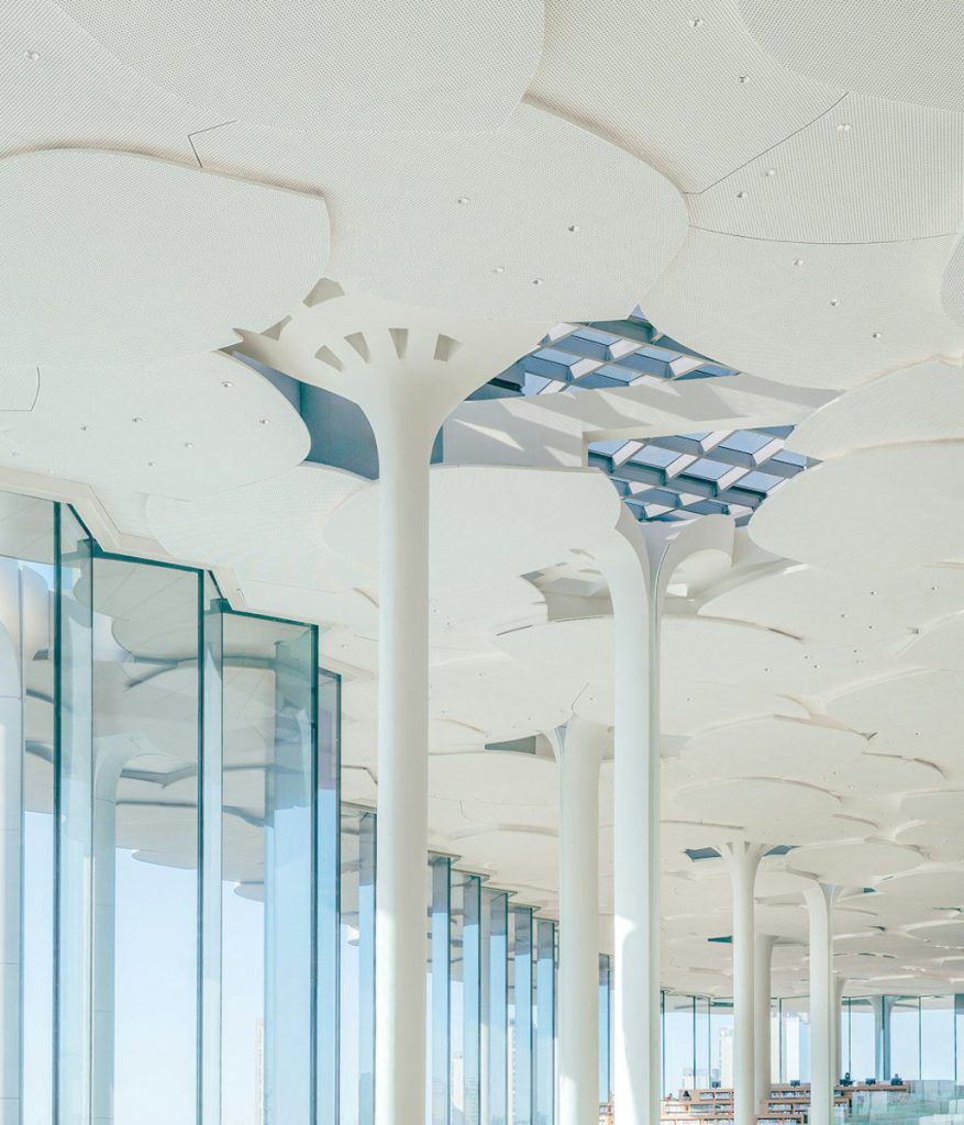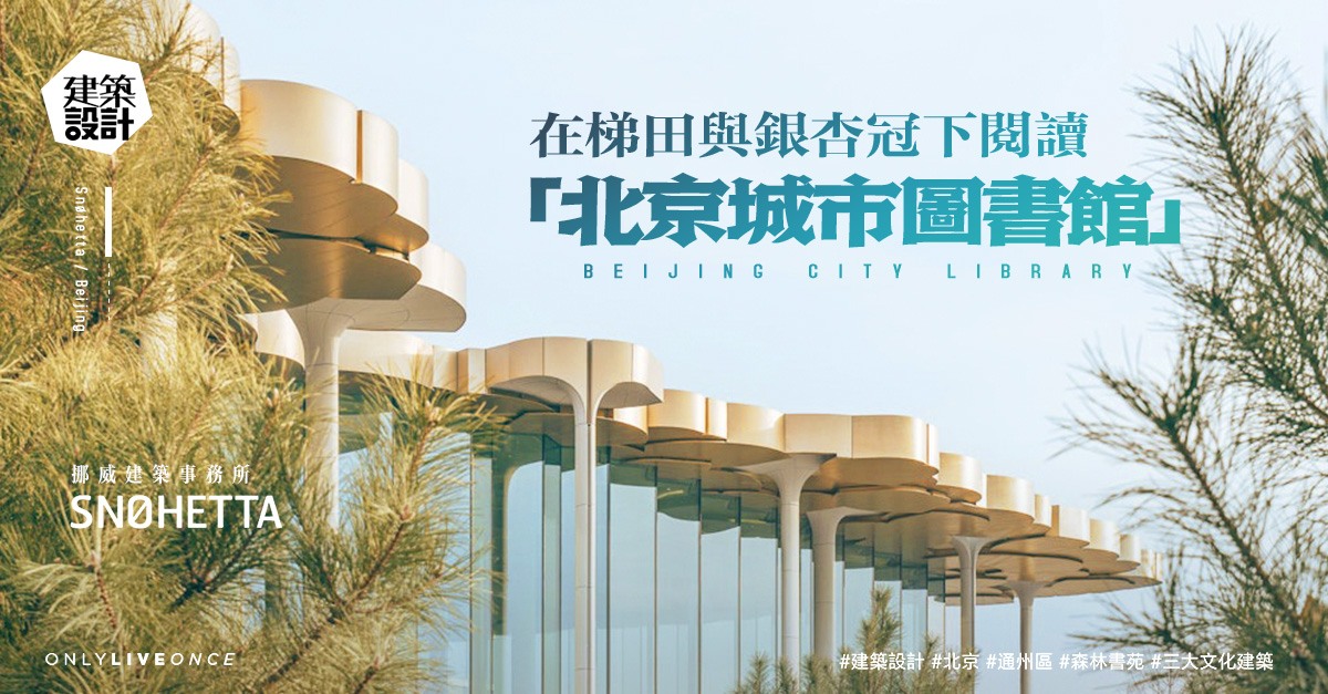 北京城市圖書館座落於通州區,跟「北京藝術中心」和「北京大運河博物館」並列當地三大文化建築,別具歷史和文化意義,Snøhetta 設計團隊從該區常見、享譽「植物界活化石」的銀杏樹筆挺形態和交疊樹冠為靈感,建成 144 道宛如樹體的細長白柱結構,再加入通透的玻璃和面板,架構出佔地約 7.5 萬平方公尺,地上三層、地下一層的單體圖書館。