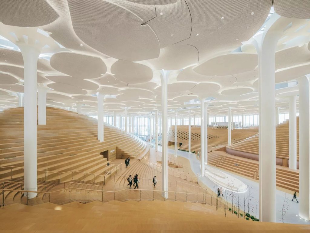 從前娛樂不多,民眾常集結大樹下講故聽故或閱讀;當今數位時代,人們的休閒活動繁多,較少聚首分享故事或書本。挪威建築事務所 Snøhetta 主理的「北京城市副中心圖書」,就運用「銀杏冠下」和「人造梯田」創造自然景觀,並結合節能技術和永續設計,定位成多功能的社區文化和生活中心,重燃群眾交流興致。