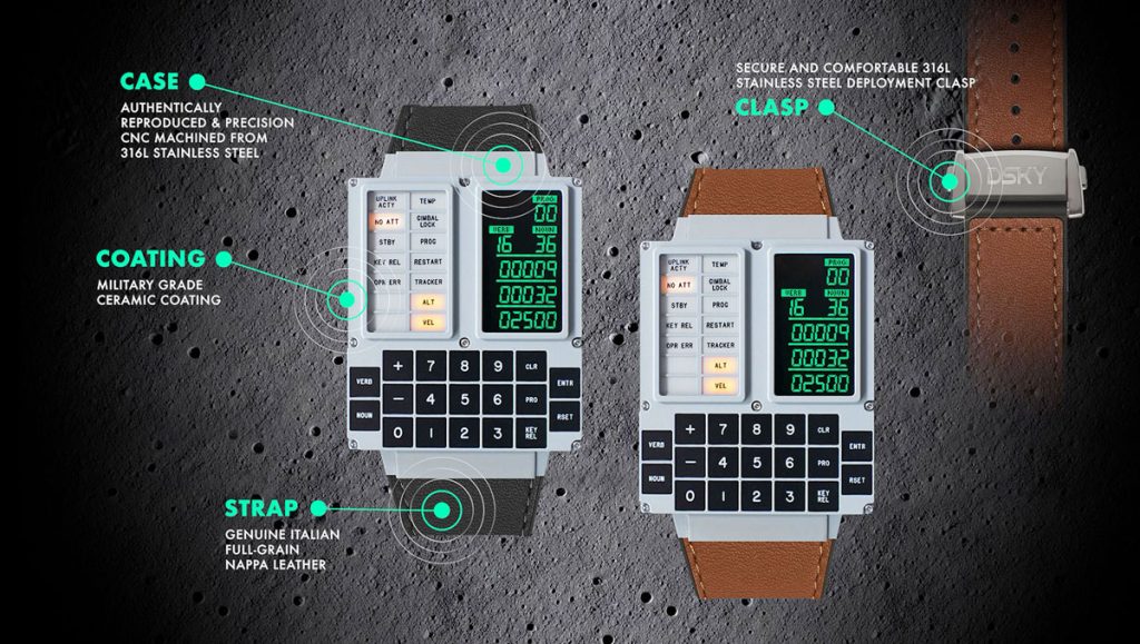 「DSKY Moonwatch」經四年精心研發,設計靈感啟發自登月艙的忙碌日常。全錶殼採用 CNC 不鏽鋼及軍用級陶瓷塗層製成,Nappa 高級皮革錶帶共設黑色及棕色兩種選項。參考航空旅程期間,太空人常要透過「制導電腦介面」控制航行路徑、飛行姿勢及作業系統等情況,錶盤又用心規劃成「DSKY」(Display and Keyboard)螢幕鍵盤佈局,襯以復古 Gorton 字體精緻還原制面標籤。