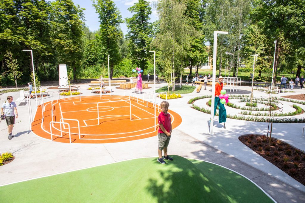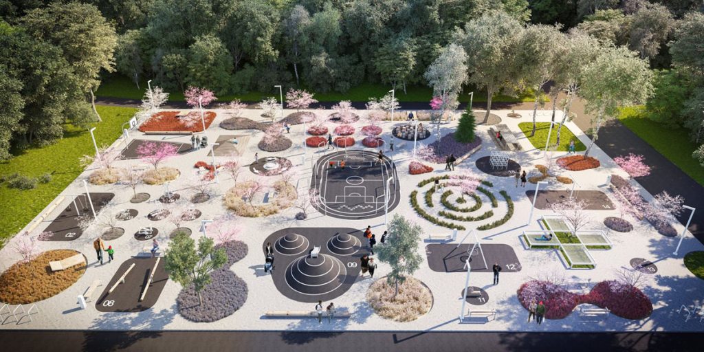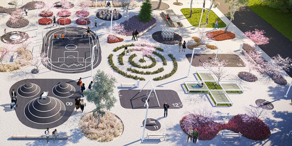 經過改建後,廢墟變成充滿活力的社區空間「Activity Zone」。團隊利用簡單的繪畫圖形與色彩,將空間劃分成數十個小區域,分隔不同功能。平凡的幾何圖形,經過疊加、排序後,成為富有趣味與美感的設計。每個小區域各有特點,包括鞦韆、滑梯、蹦床、攀爬架、球類等,還有小型裝置和綠化空間。散落其中的特色座椅,讓各個群體彼此看見,促進互動。