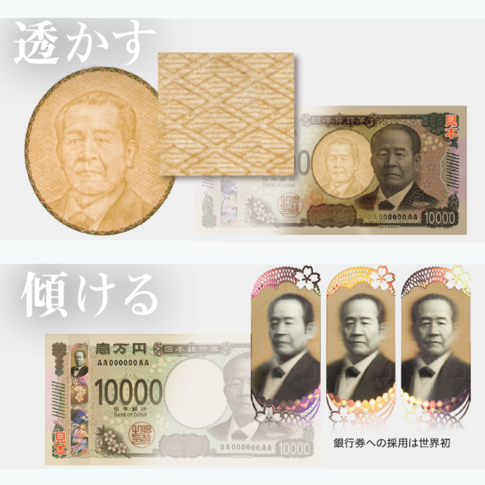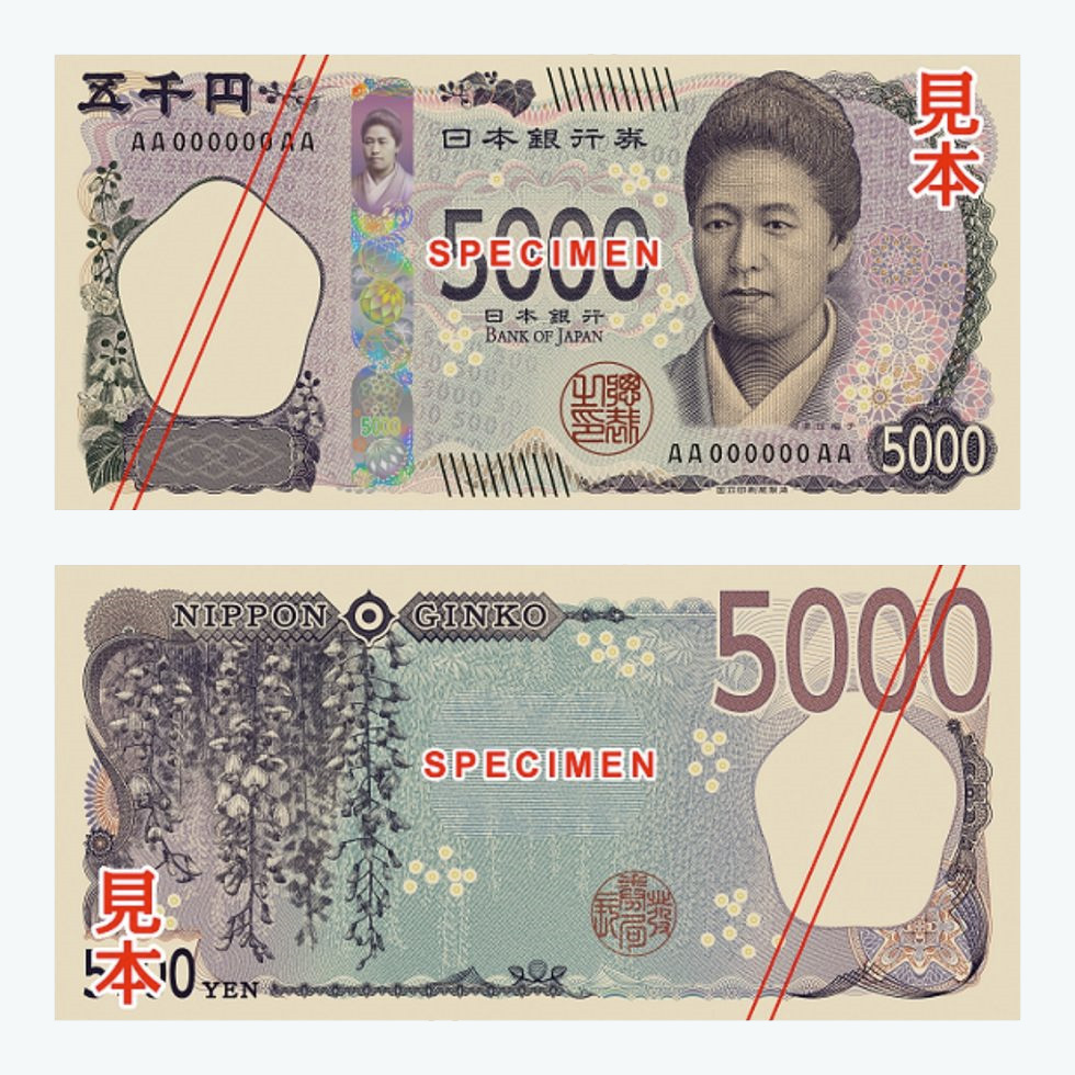 一萬日圓紙鈔的新肖像「近代醫學之父」渋沢栄一,提倡「公益第一」的經濟道德觀,奠基日本的商業繁榮,故背面就採用東京車站丸之內的典雅「赤煉瓦」紅磚建築,彰顯萬元鈔票的重要性。五千日圓紙鈔,則換上「女子教育先驅」津田梅子,背面所印的紫藤花象徵女性堅毅,並讚頌其創辦「女子英學塾」(津田塾大學)等貢獻。