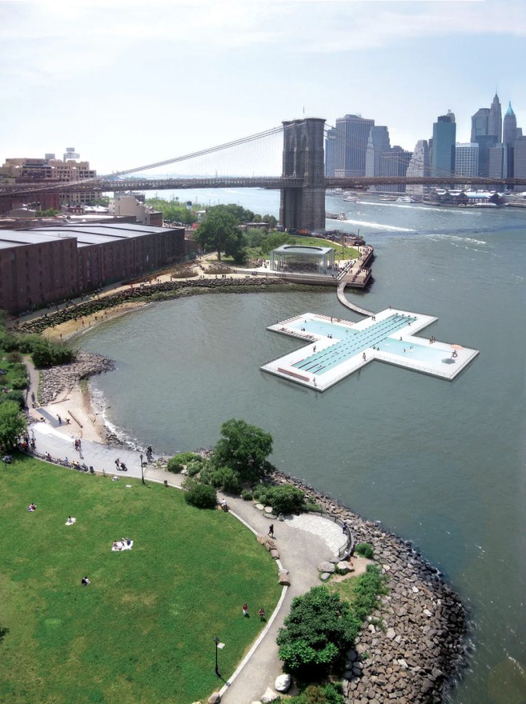面對氣候暖化及後疫挑戰,紐約州政府與市政府出資,於知名地標曼哈頓大橋的 35 號碼頭(Pier 35)河面上,創建第一座公共漂浮泳池「+ POOL」,作為最新水質過濾示範項目。