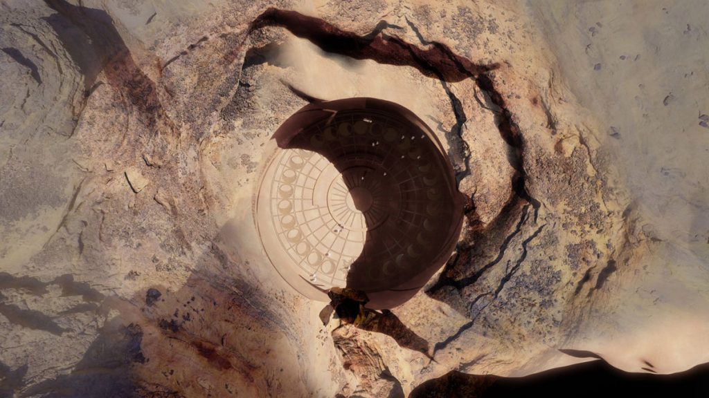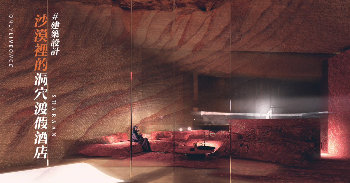 沙特阿拉伯古城 AlUla 的沙漠中,有一座砂岩石群將會化身成洞穴渡假酒店Sharaan。酒店將會從巨石懸崖挖建出四十間房間,一個會議中心,三座渡假村。酒店入口處前庭建在山腰,是大型的圓形日晷,80米長的電梯貫穿所有樓層,現代設備鑲嵌在自然地質當中。當酒店房間燈亮著以後,現代之光穿透風化岩石牆上密密麻麻的細洞照亮了石牆,照見了蟄伏於沙土中的歷史。酒店預計於2023年落成。