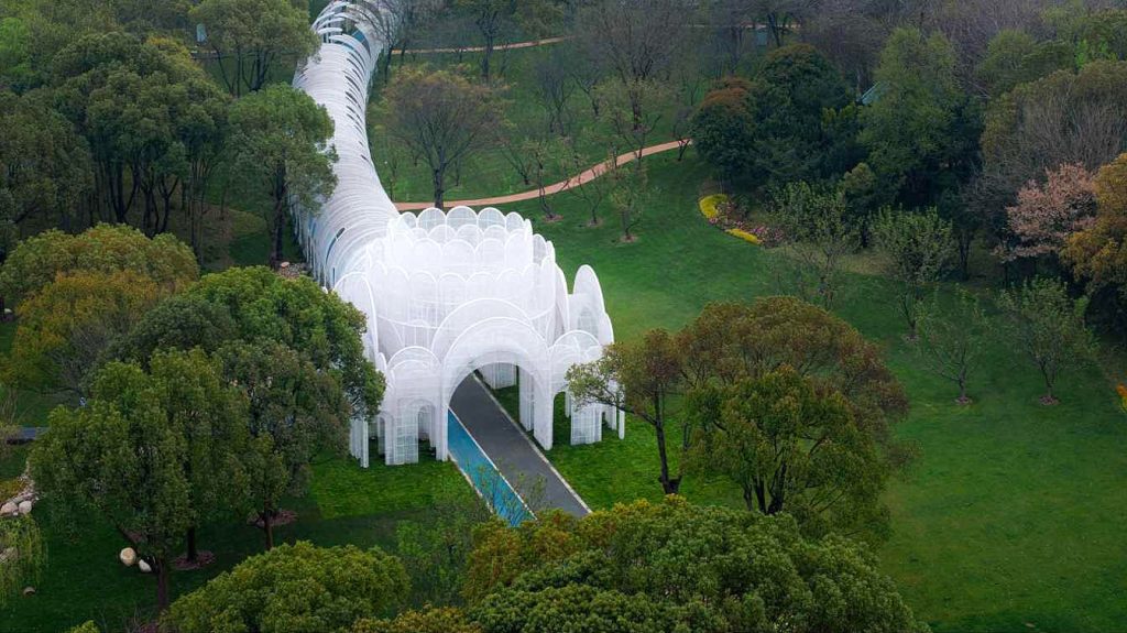 公園原有一座長達一公里的鋼架,其上有紫藤和玫瑰牽繞而生,氣氛清雅。惟經過長年累月的風吹雨打,令鋼材結構日漸老化,基於安全必須重建。Wutopia Lab 參考蠡湖的典故和中國庭園造景,採用圓形鋼管及白色塗層鋼網,取代傳統的竹子及木材,沿舊有地段重新建設一座更有當代感的白鋼長廊。