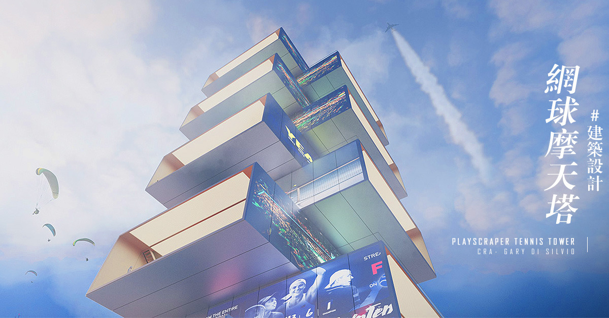 但意大利建築團隊Carlo ratti associati和italo rota,為歐洲運動媒體平台RCS sport設計了名為「playscraper」的網球塔。塔由8個交叉疊放巨大的長方形「箱子」組成,共65000呎的球場面積,參考自太空艙的和組合方式,其輕盈的新型不銹鋼質料可疊至如此高而同時可拆件運載至不同地方,配合網球比賽的巡迴性質,連球場都可以巡迴遷移。全球化下,我們的生活流動,不見邊際。