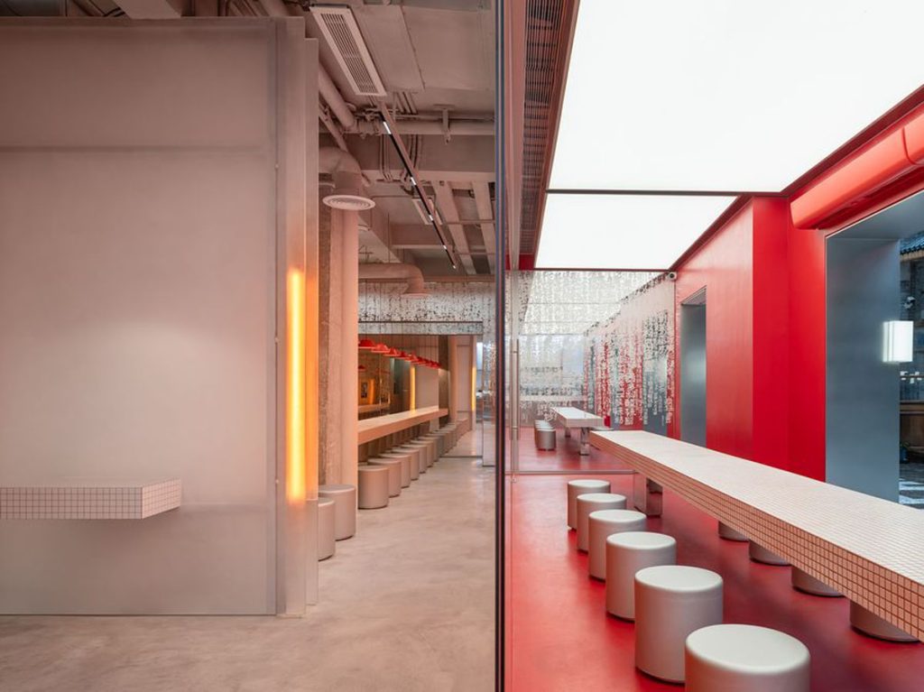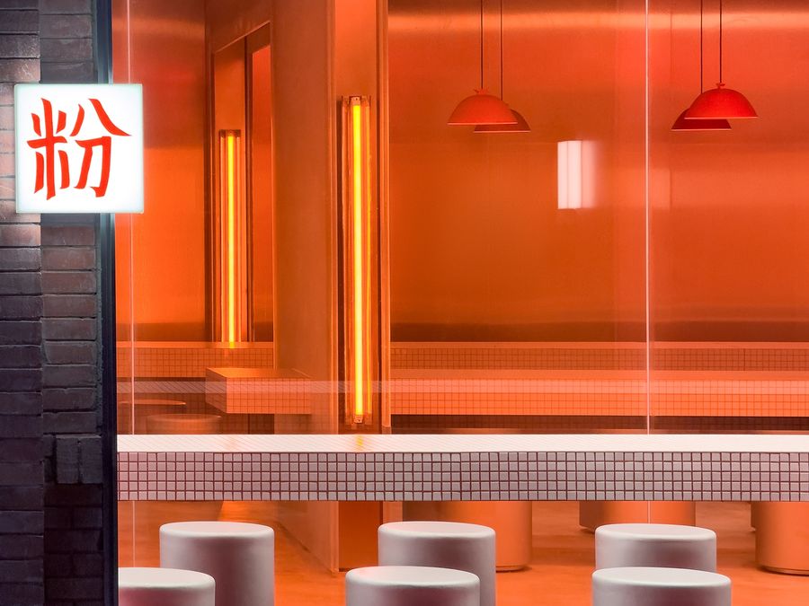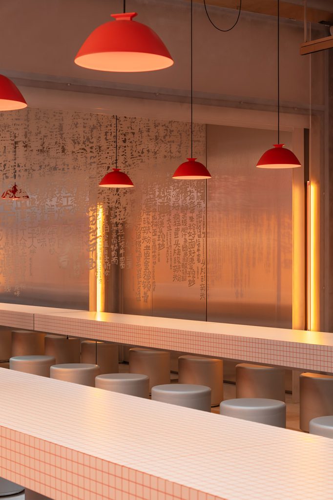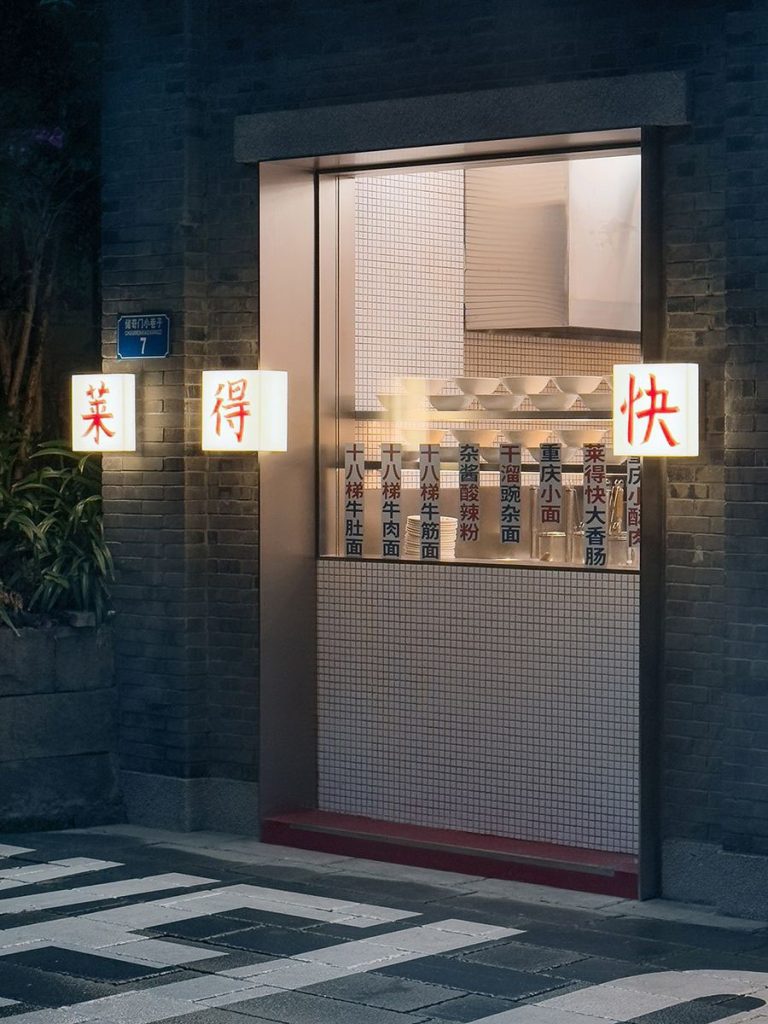 重慶十八梯自南宋以來,承載了豐富人文歷史和經濟價值,Office AIO 受啟發將「萊得快麵館」定調成融合重慶經典麵食及新派服務的餐館。店舖座落一條小巷內、四幢連排建築一樓的位置,團隊用上鮮明的橘色作品牌識別,讓店面和地坪發出醒目又暖紅的燈光,路人一望即聯想到重慶麵食的辛辣香濃。