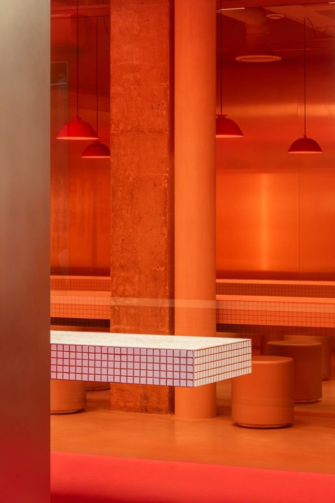 室內劃分成 A、B、C 三大區域。A 區設點餐、取餐及結帳的接待區,並因應附近李子垻輕軌站「橋穿高樓」特殊景象,設橫亙於空間的 9 公尺和 12 公尺餐桌;半戶外用餐區選用瑞典 Wastberg 的 Sempe 紅吊燈、白色馬賽克磚訂製長桌等,時尚地再現老派排檔風情。